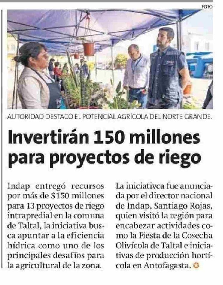 Invertirán 150 millones para proyectos de riego 25-04-2025 La Estrella de Antofagasta |