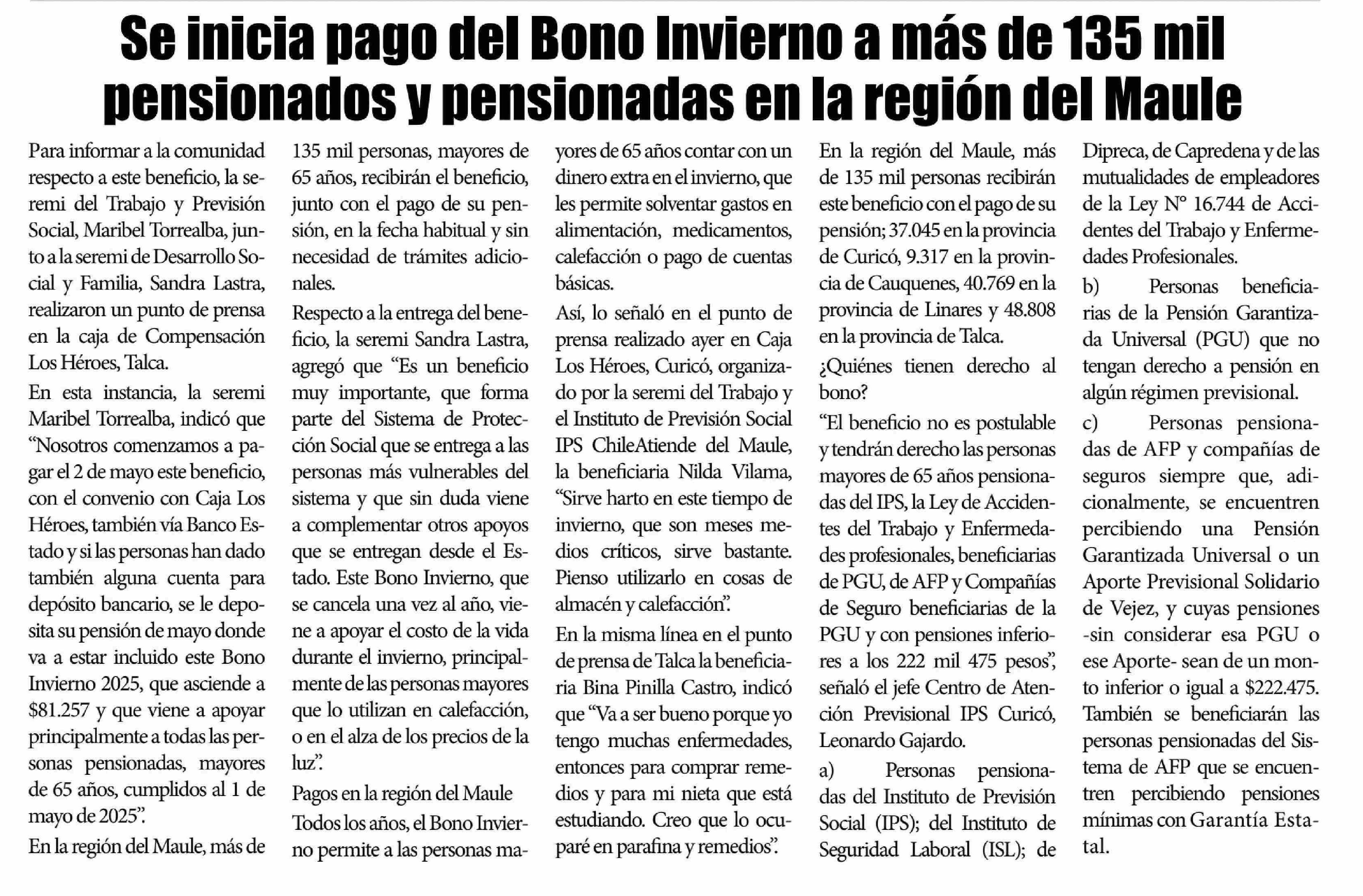 Título: Se inicia pago del Bono Invierno a más de 135 mil pensionados y pensionadas en la región del Maule