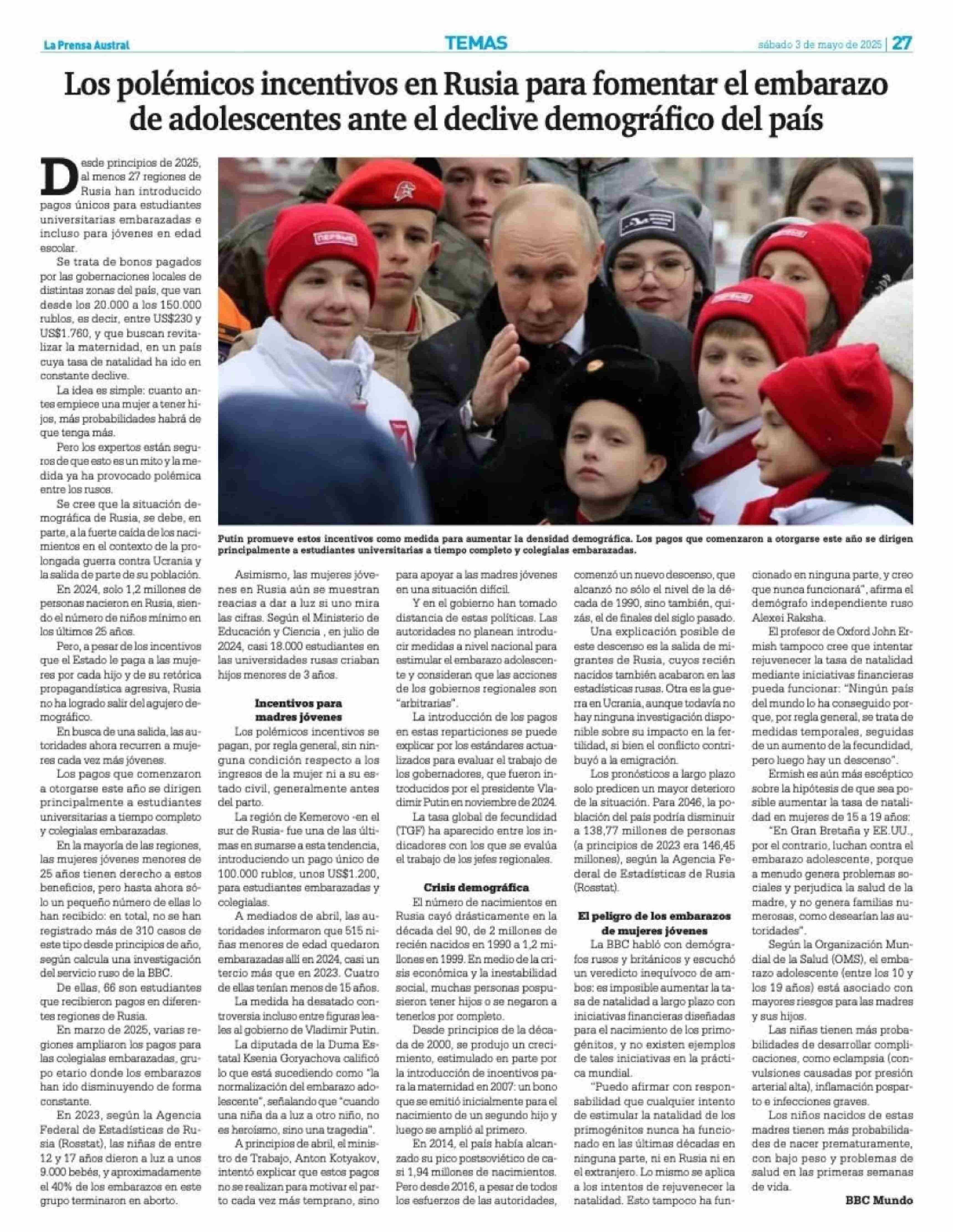 Los polémicos incentivos en Rusia para fomentar el embarazo de adolescentes ante el declive demográfico del país 03-05-2025 La Prensa Austral |