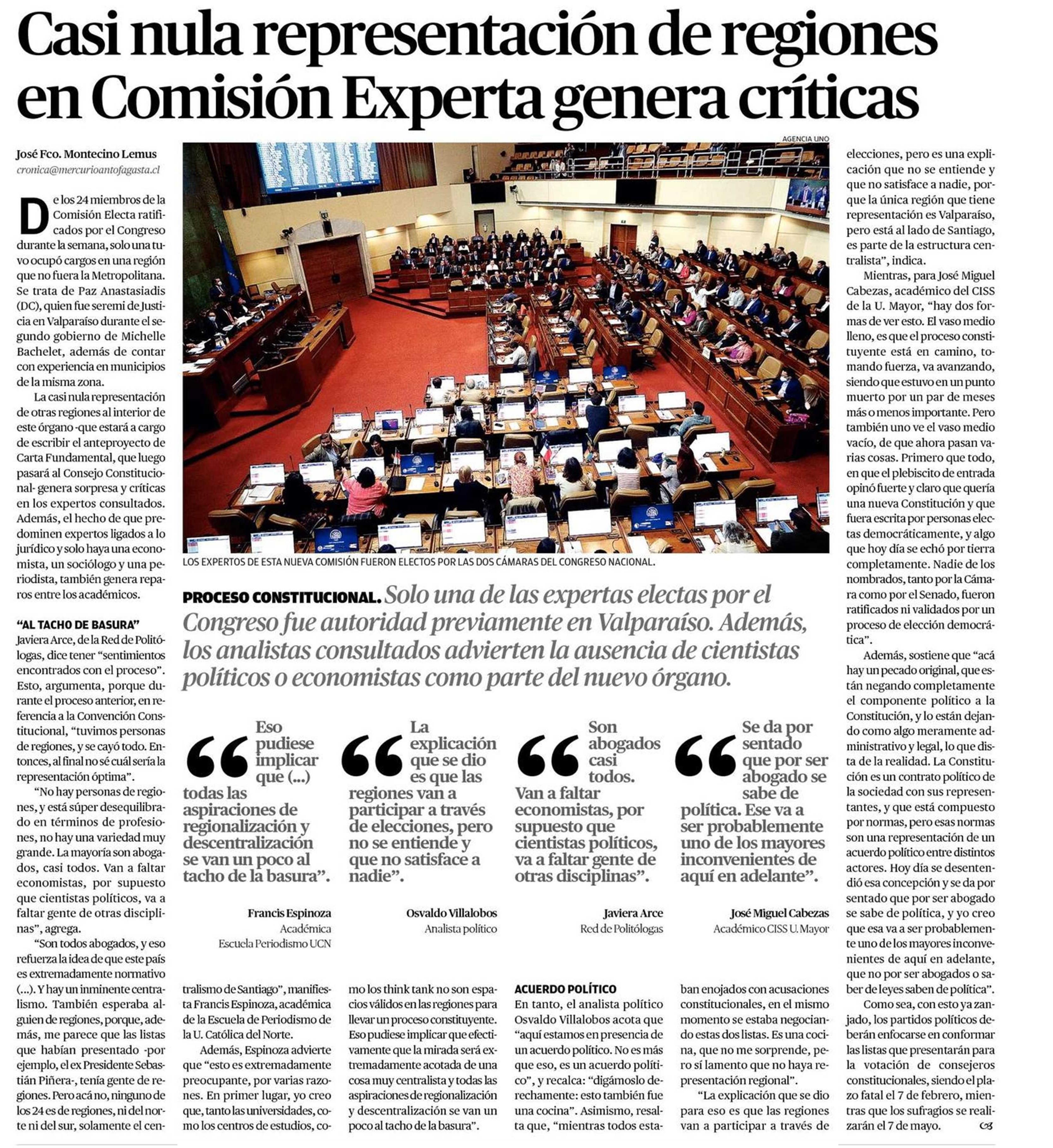 Casi nula representación de regiones en Comisión Experta genera críticas 27-01-2023 El Mercurio de Antofagasta |