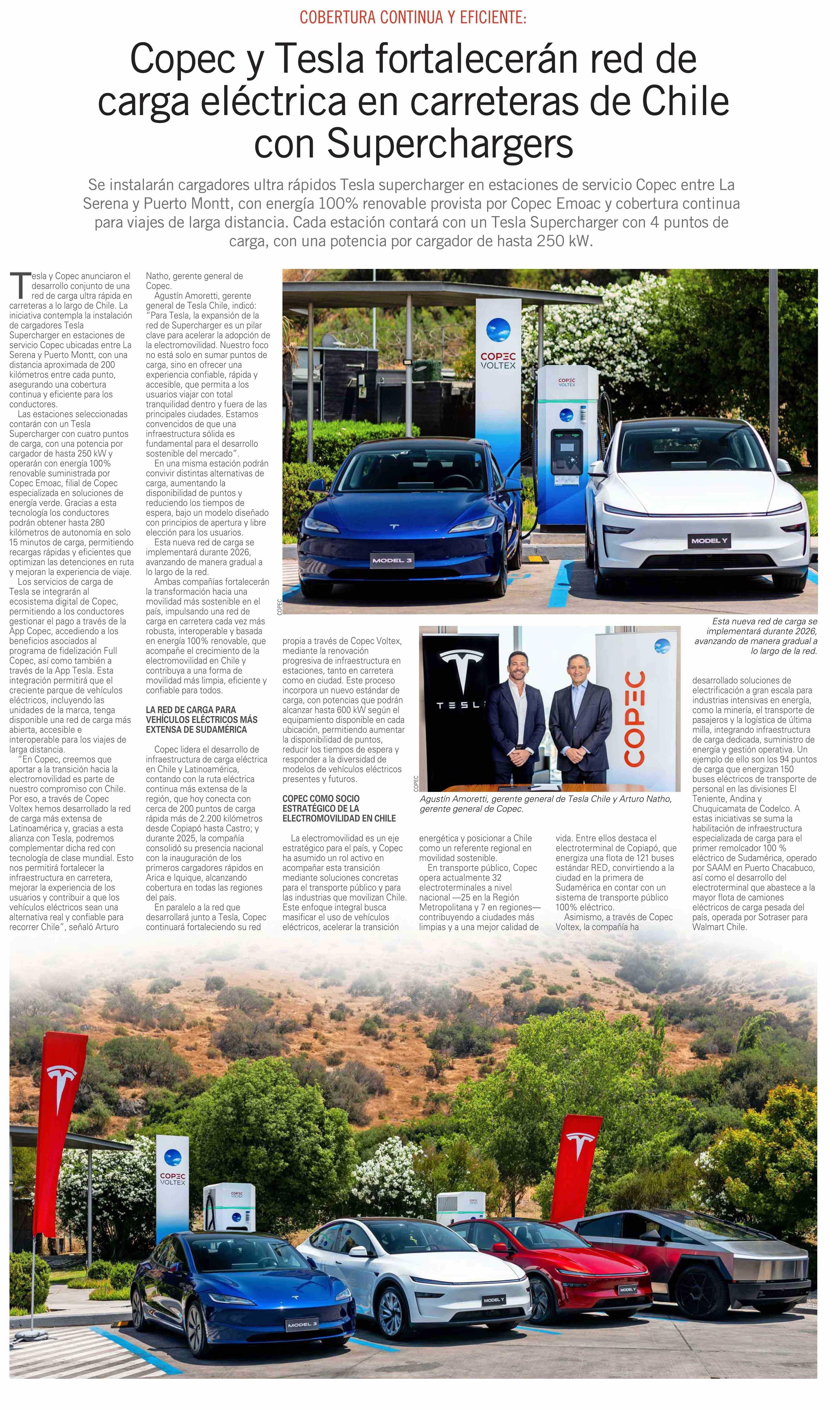 Copec y Tesla fortalecerán red de carga eléctrica en carreteras de Chile con Superchargers 01-02-2026 El Mercurio |