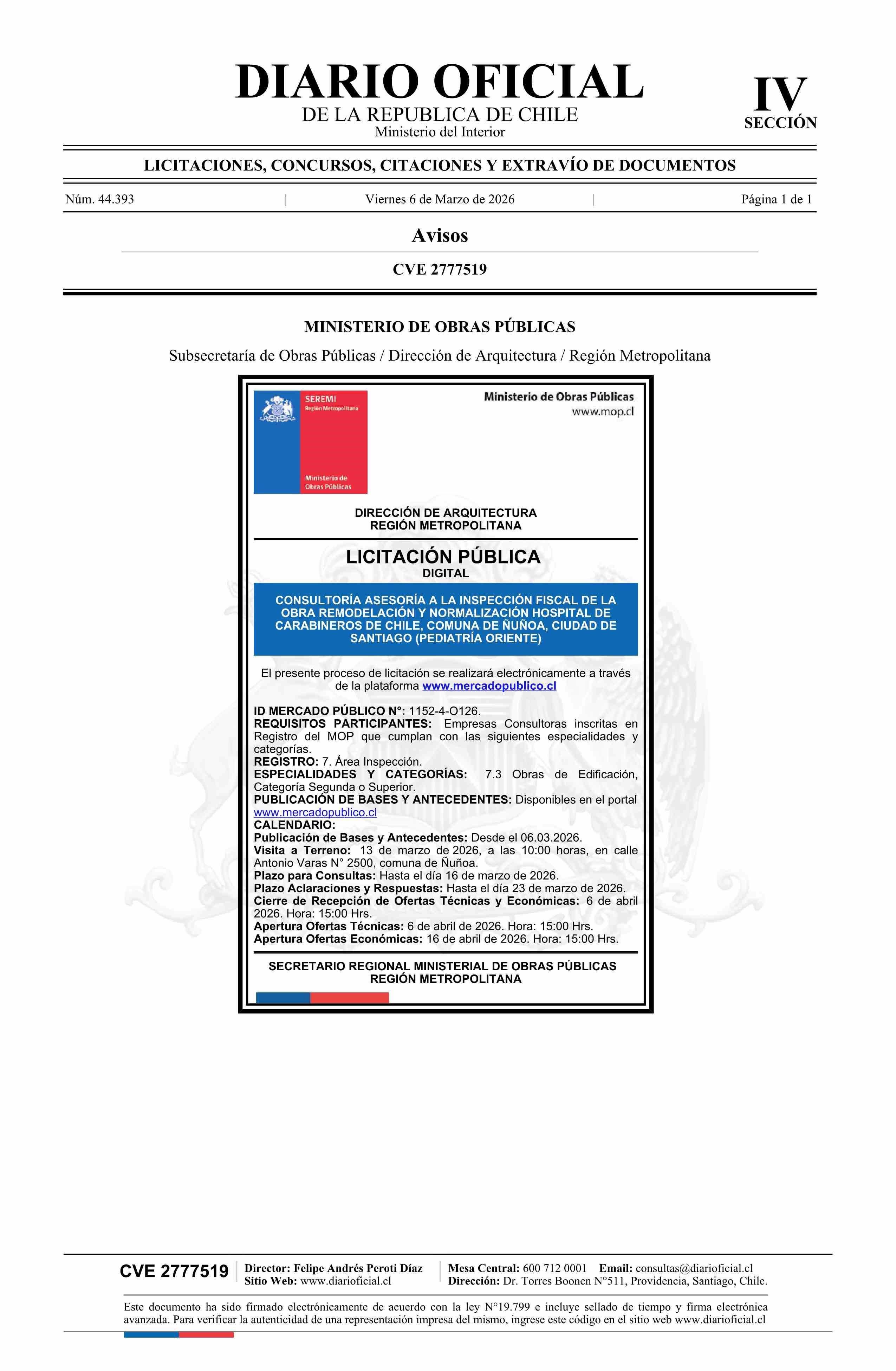| Fecha: | 06-03-2026 | Sector: | Aviso Licitaciones | Región: | Región Metropolitana de Santiago |
