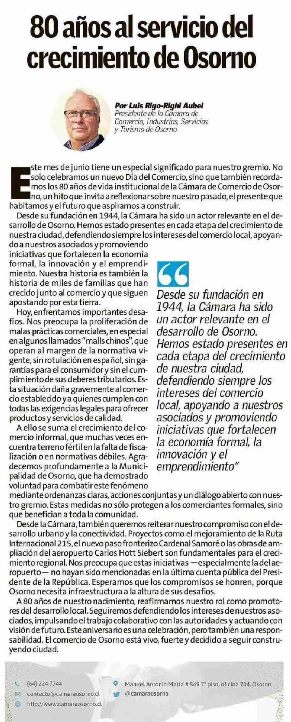 Cartas: 80 Años al servicio del crecimiento de Osorno 06-06-2025 El Austral de Osorno |