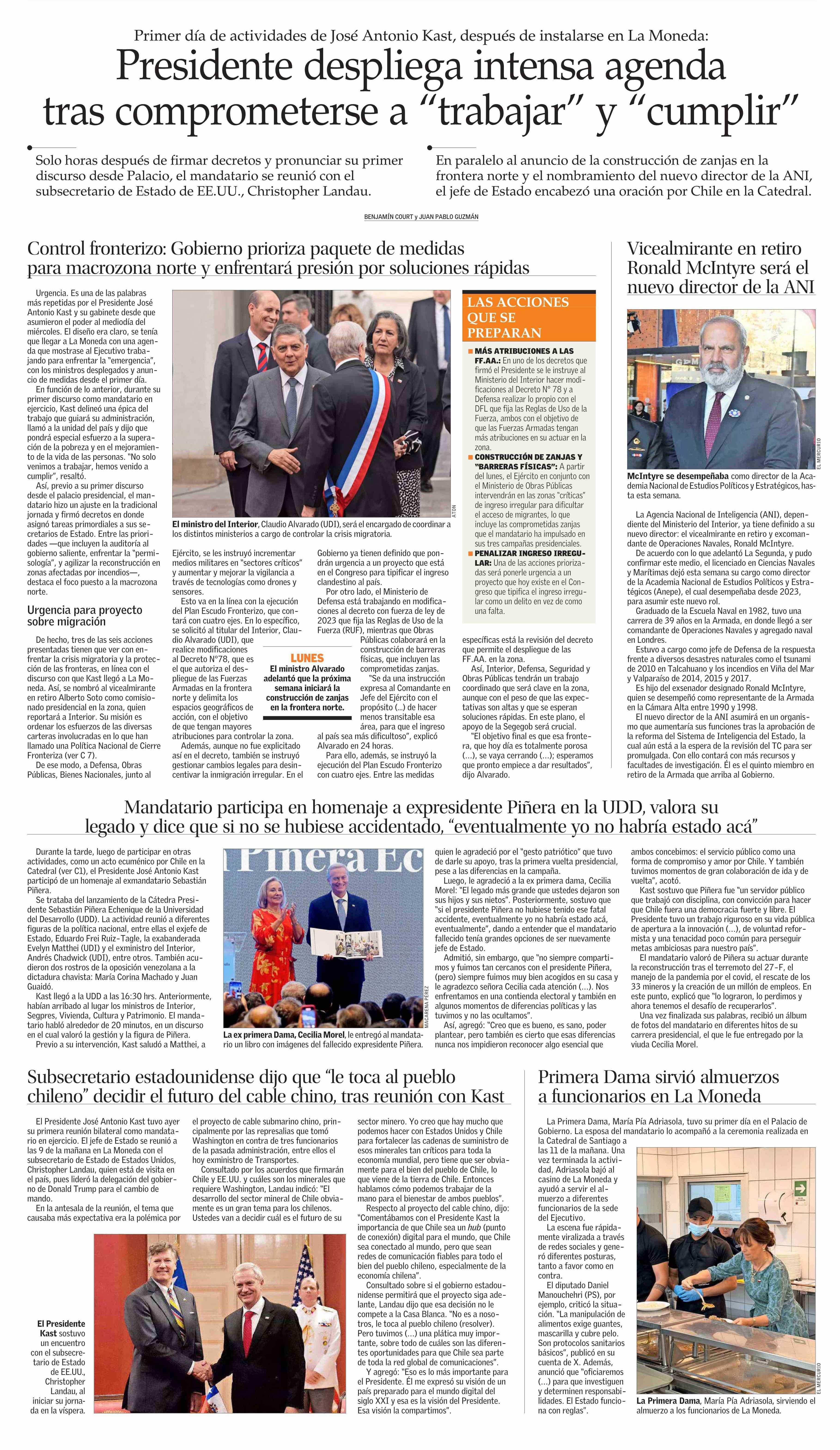 Presidente despliega intensa agenda tras comprometerse a "trabajar" y "cumplir" 13-03-2026 El Mercurio |