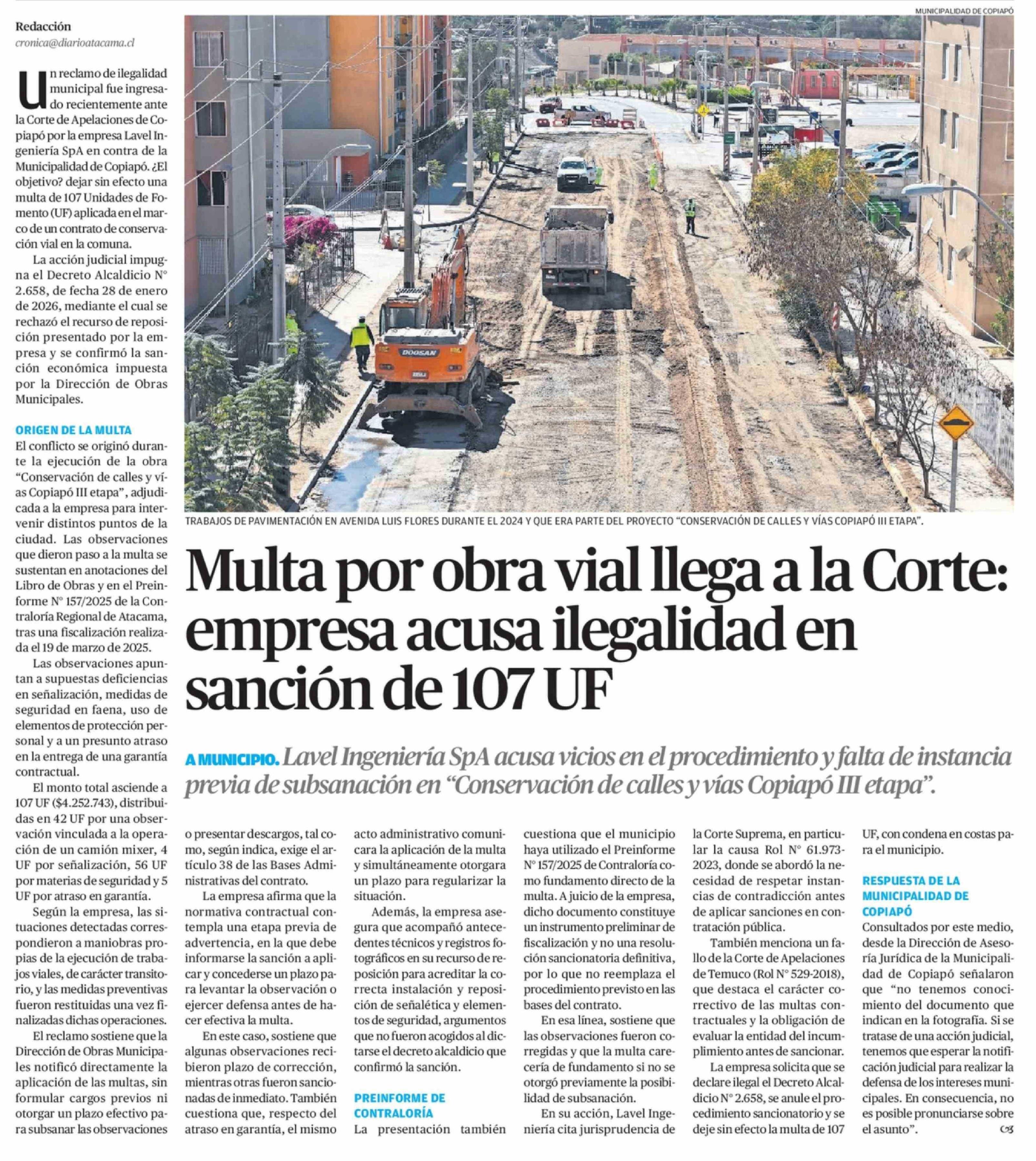 Título: Multa por obra vial llega a la Corte: empresa acusa ilegalidad en sanción de 107 UF