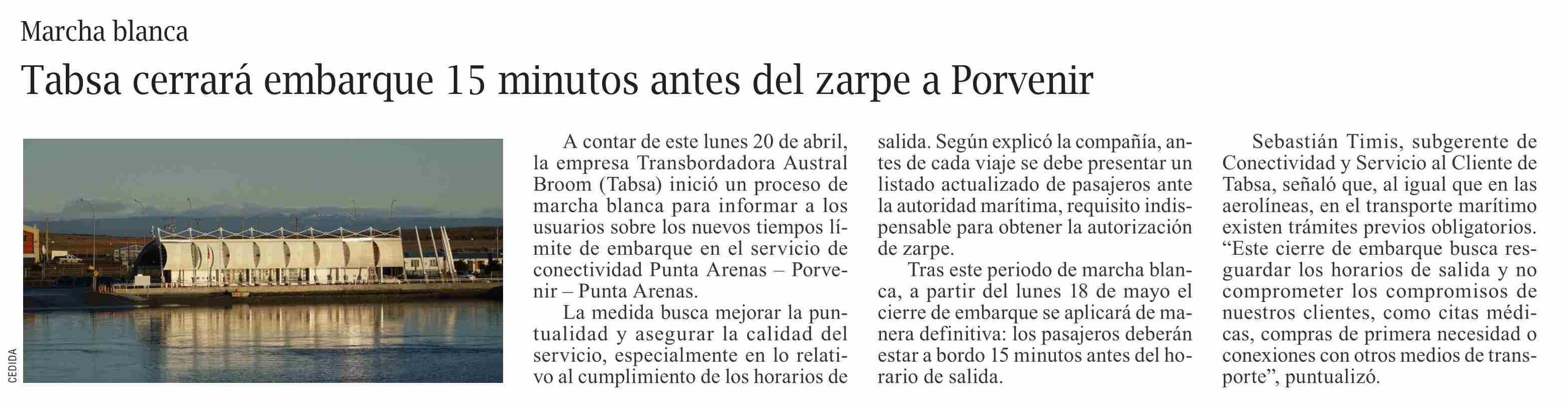 | Título: | Tabsa cerrará embarque 15 minutos antes del zarpe a Porvenir |