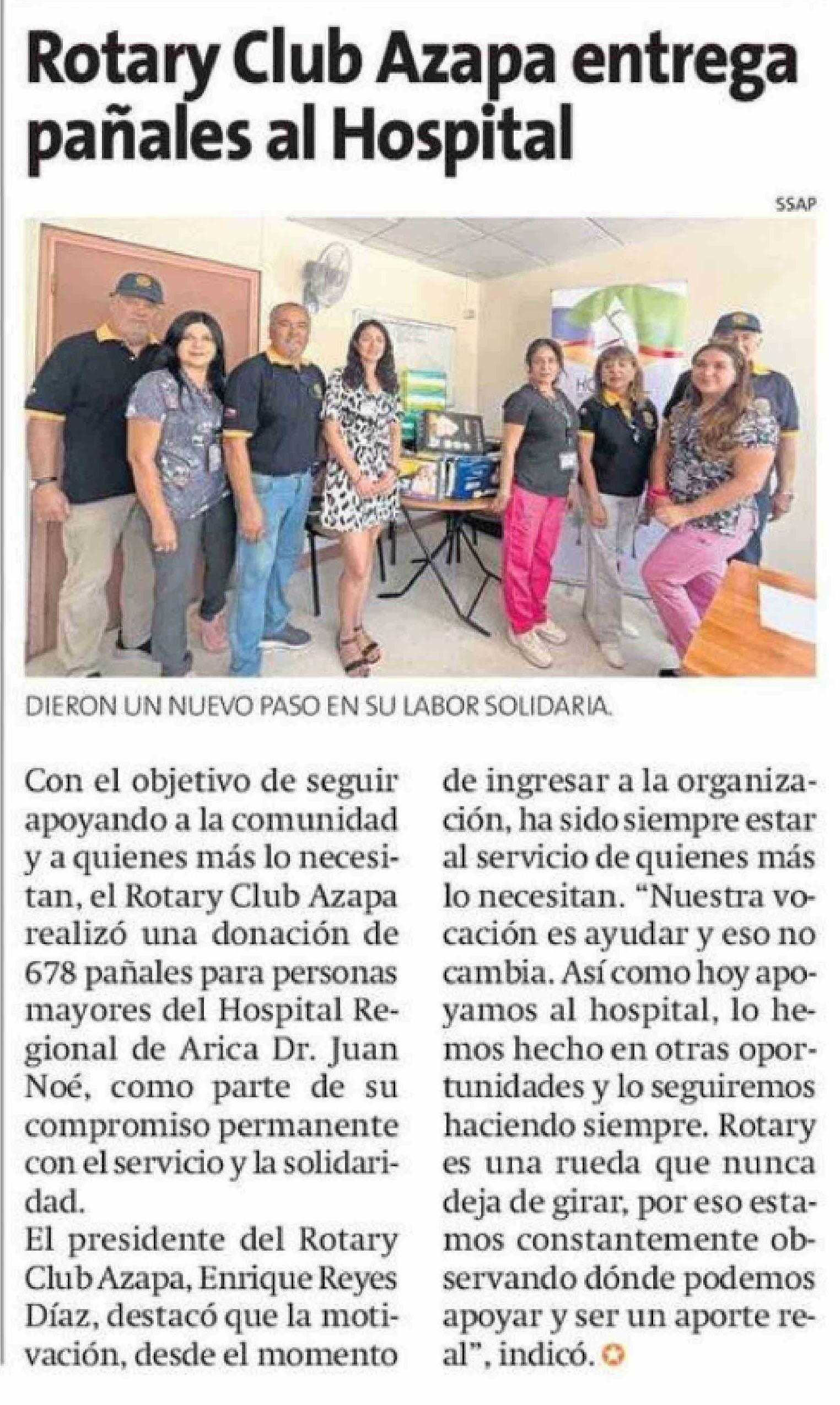 | Título: | Rotary Club Azapa entrega pañales al Hospital |