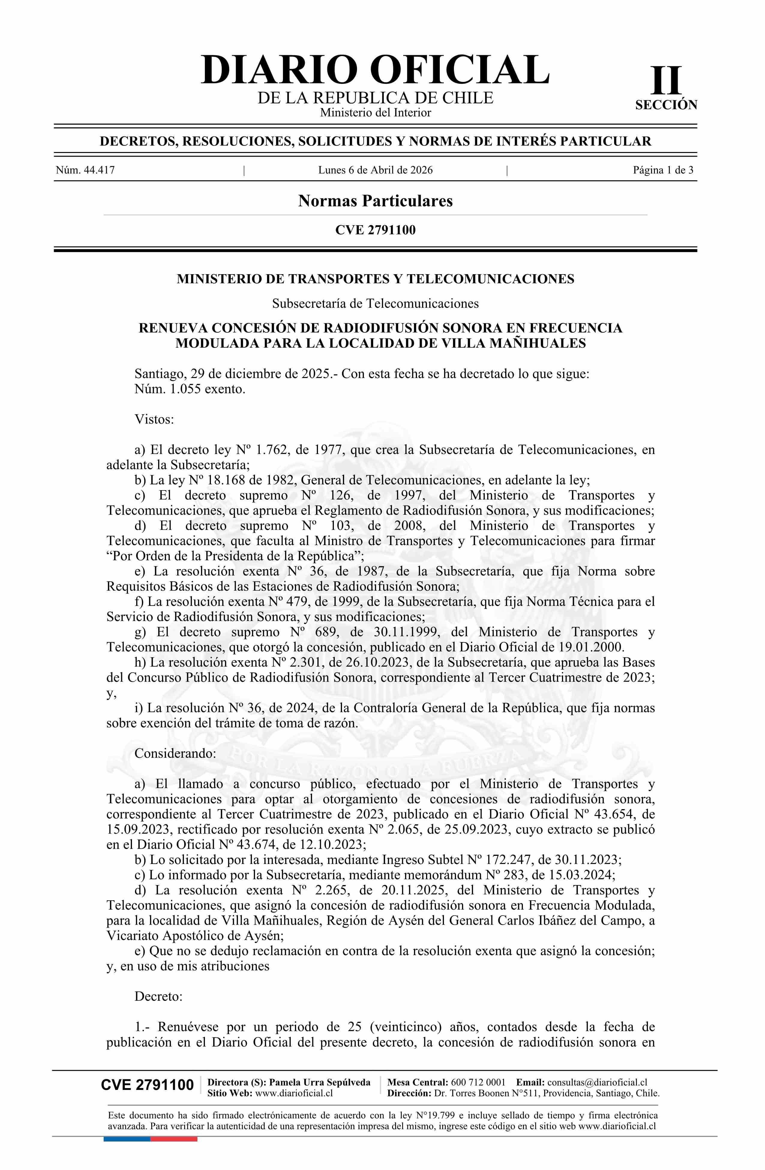 Decreto exento número 1.055, de 2025.- Renueva concesión de radiodifusión sonora en frecuencia modulada para la localidad de Villa Mañihuales 06-04-2026 Diario Oficial Edición Electrónica |