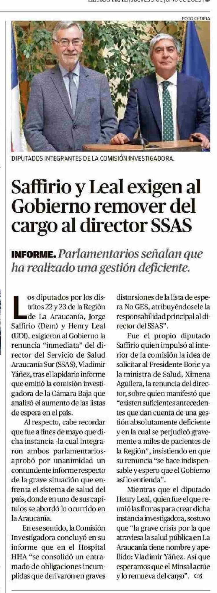 Saffirio y Leal exigen al cargo al director SSAS Gobierno remover del 05-06-2025 El Austral de la Araucanía |