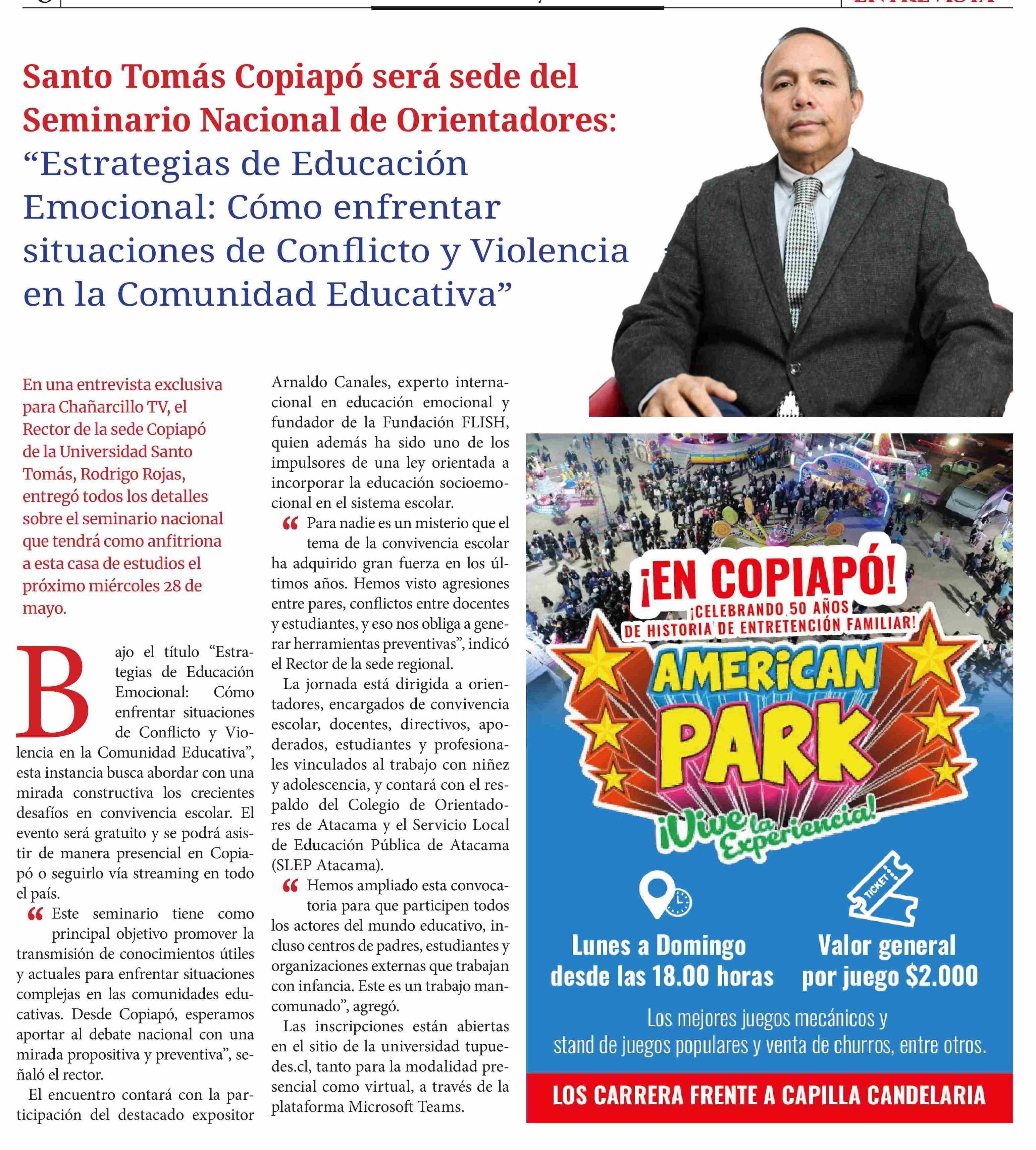 Título: Santo Tomás Copiapó será sede del Seminario Nacional de Orientadores: “Estrategias de Educación Emocional: Cómo enfrentar situaciones de Conflicto y Violencia en la Comunidad Educativa”