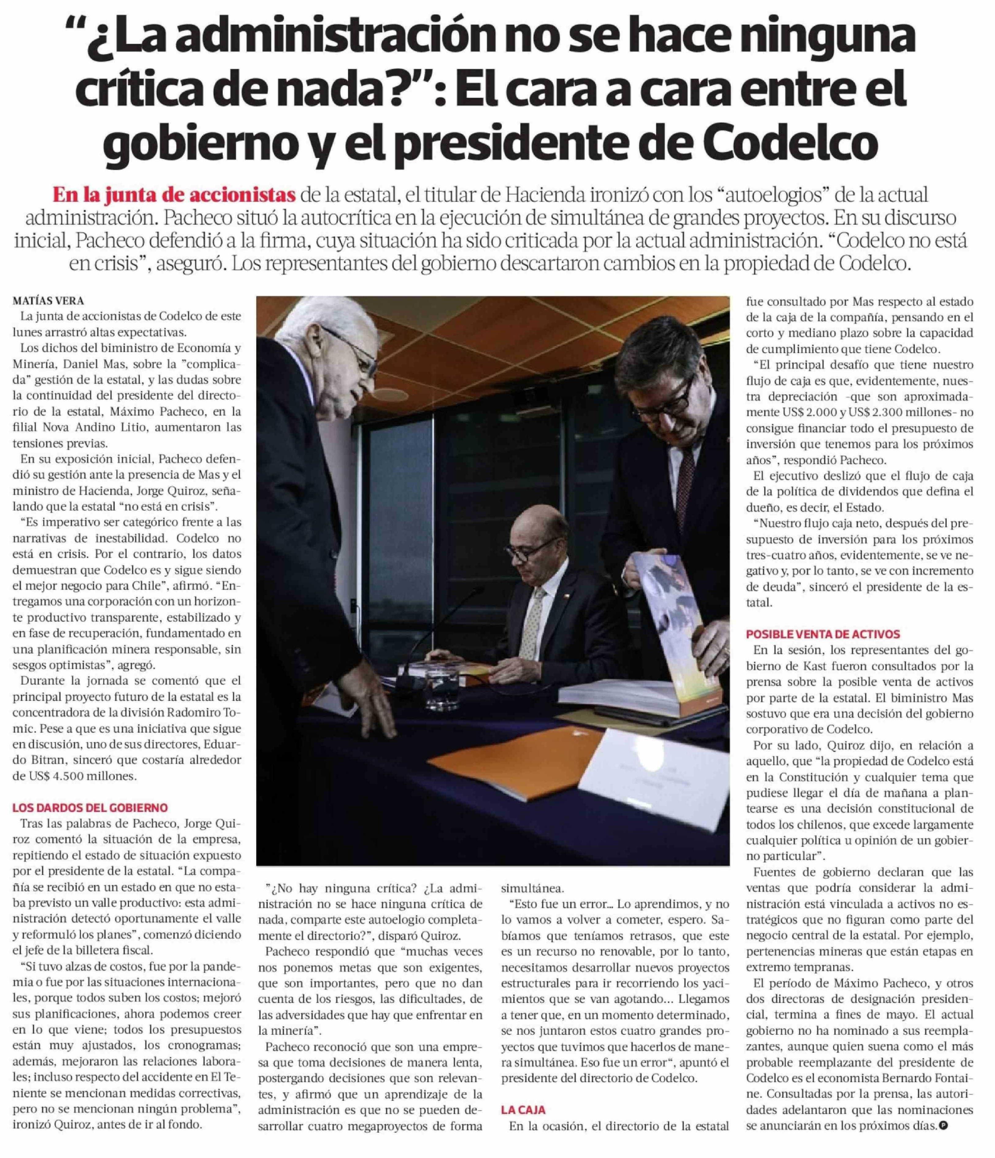 "¿La administración no se hace ninguna crítica de nada?": El cara a cara entre el gobierno y el presidente de Codelco 21-04-2026 La Tercera |