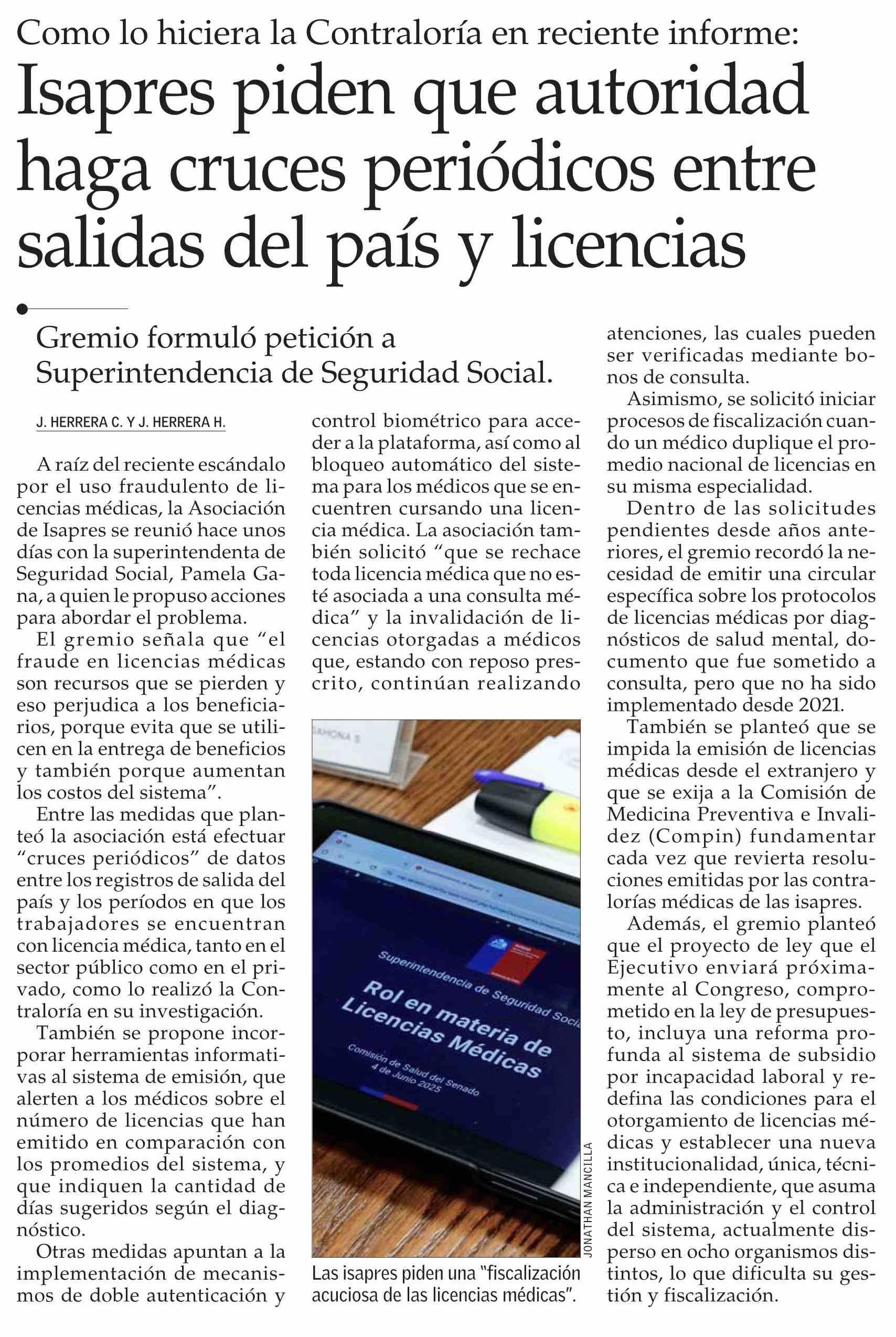 Título: Isapres piden que autoridad haga cruces periódicos entre salidas del país y licencias
