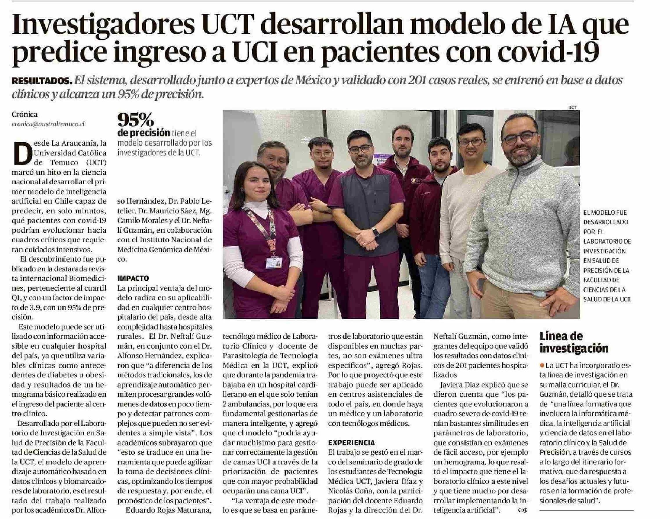 Investigadores UCT desarrollan modelo de IA que predice ingreso a UCI en pacientes con covid-19 09-06-2025 El Austral de la Araucanía |