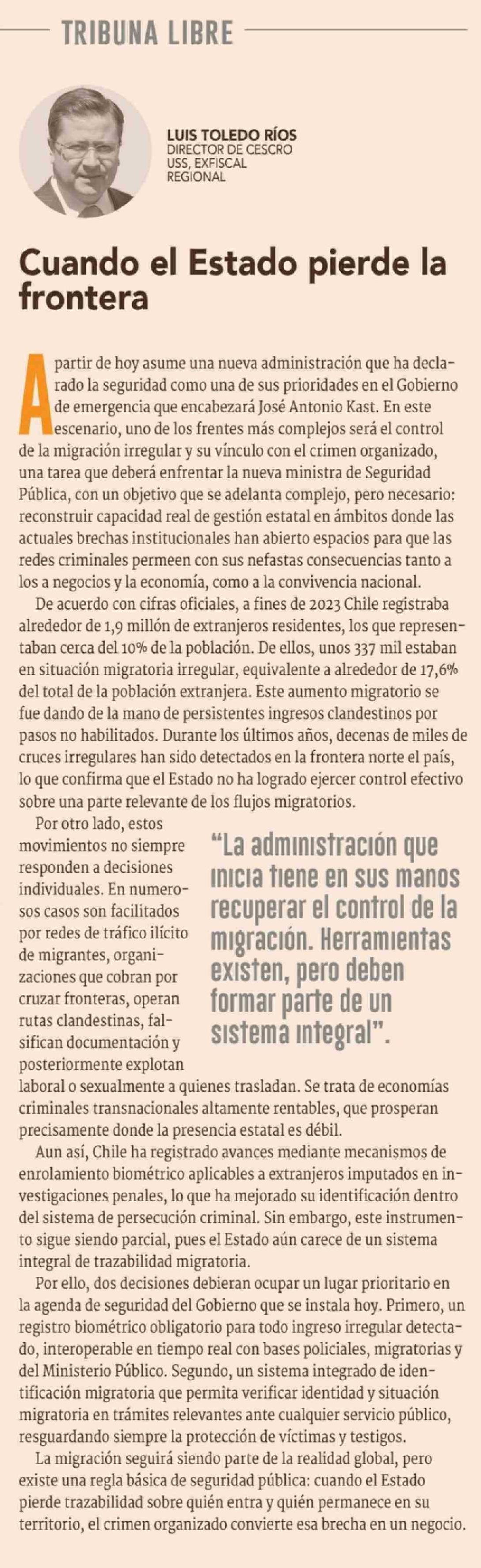 Columnas de Opinión: Cuando el Estado pierde la frontera 11-03-2026 Diario Financiero |