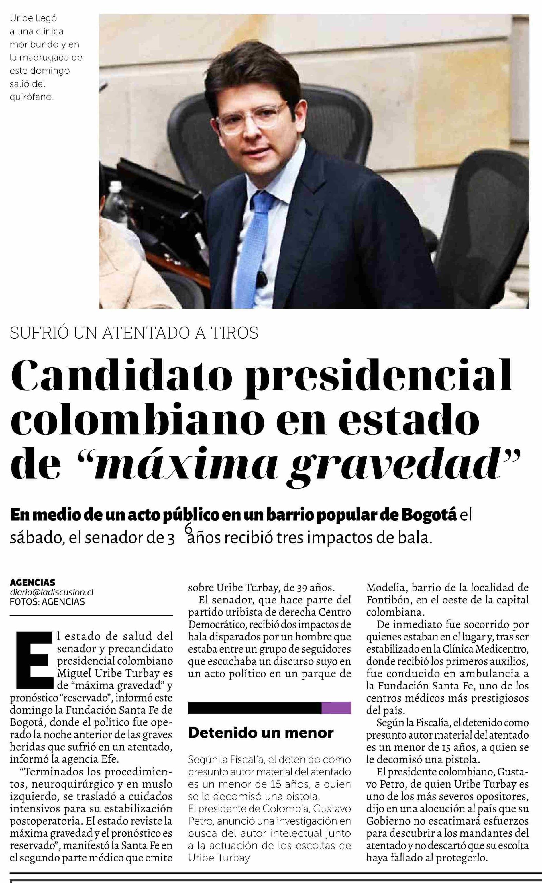 Candidato presidencial colombiano en estado de “máxima gravedad” 09-06-2025 La Discusión |