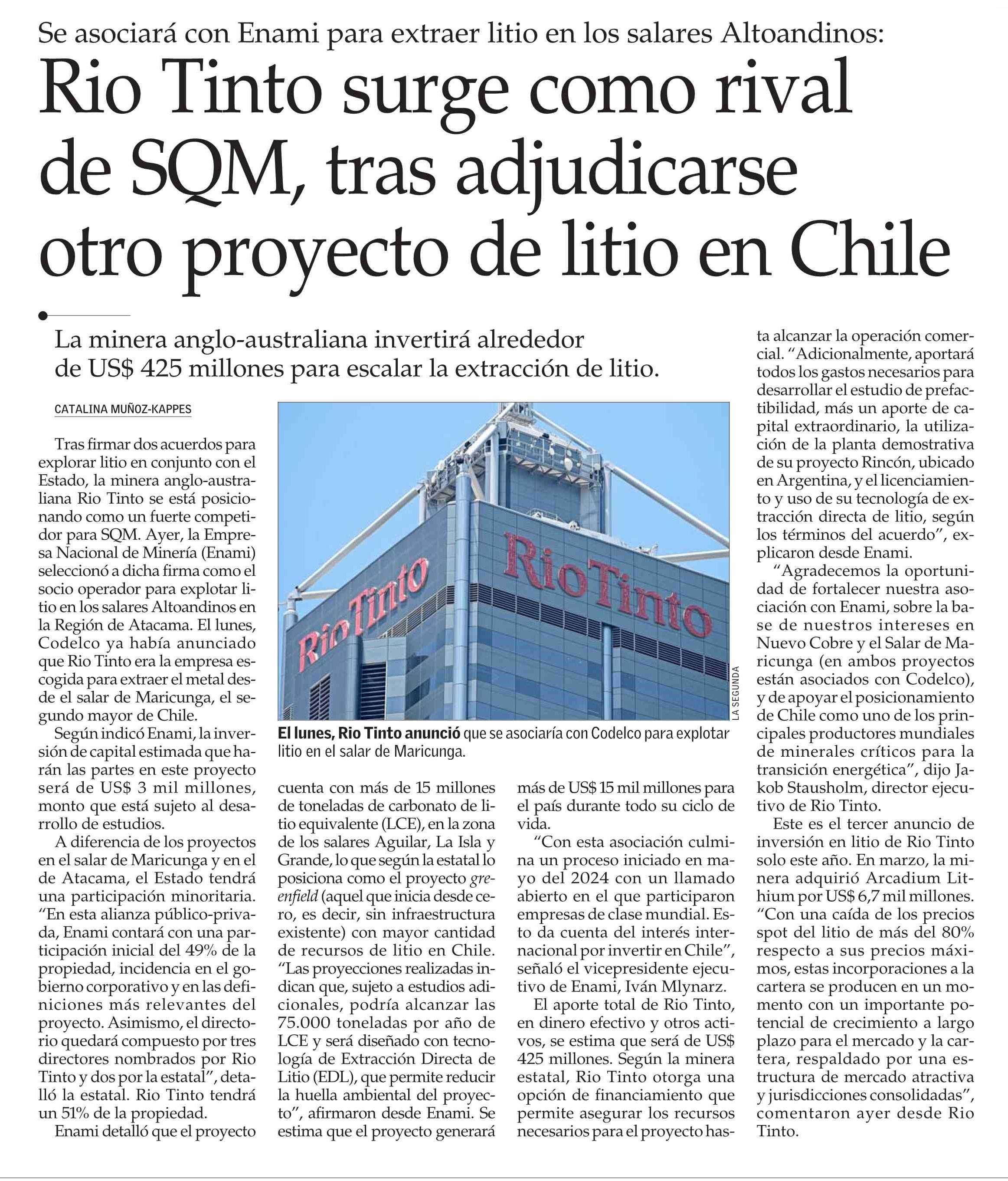 Rio Tinto surge como rival de SQM, tras adjudicarse otro proyecto de litio en Chile 23-05-2025 El Mercurio |