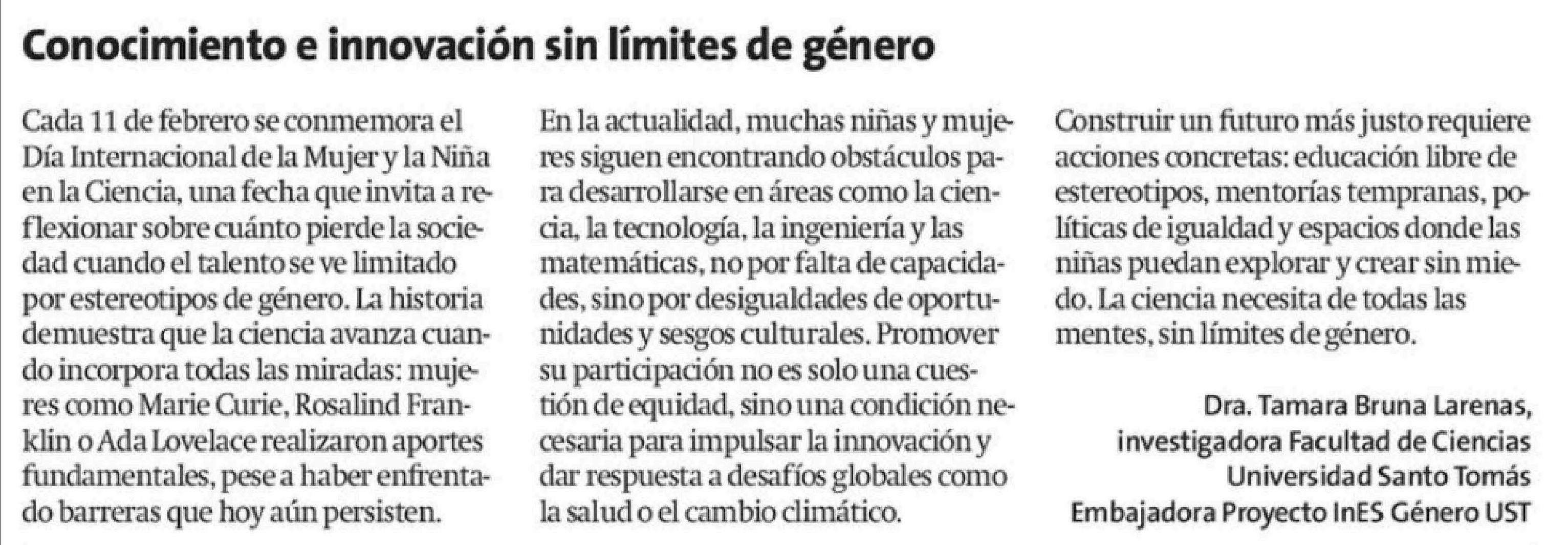 Cartas: Conocimiento e innovación sin límites de género 11-02-2026 La Estrella de Iquique |