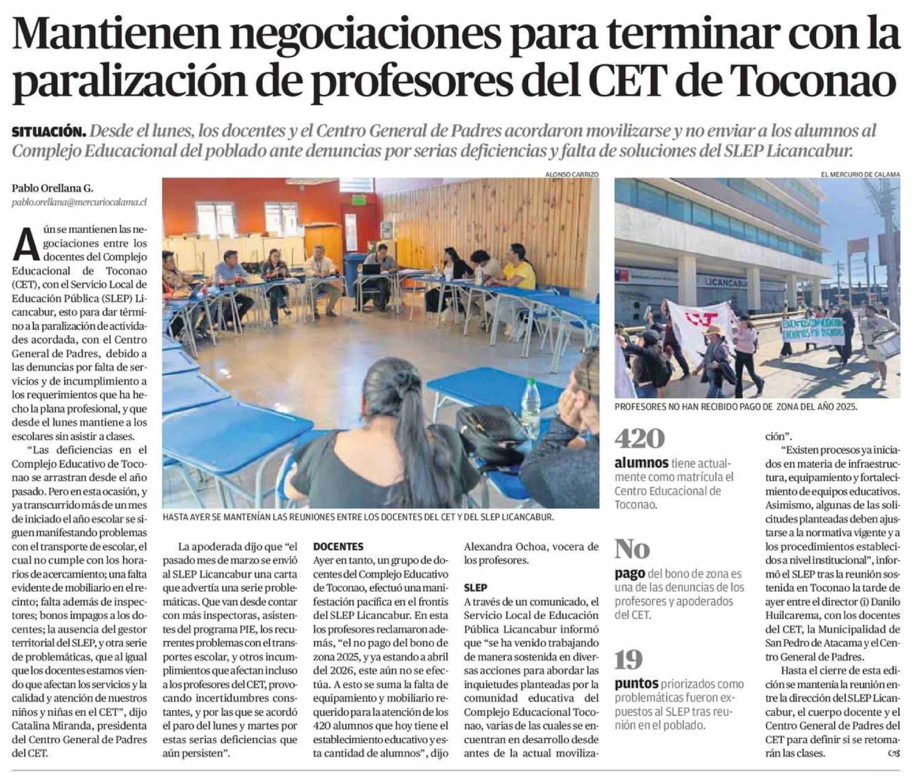 Mantienen negociaciones para terminar con la paralización de profesores del CET de Toconao 22-04-2026 El Mercurio de Calama |