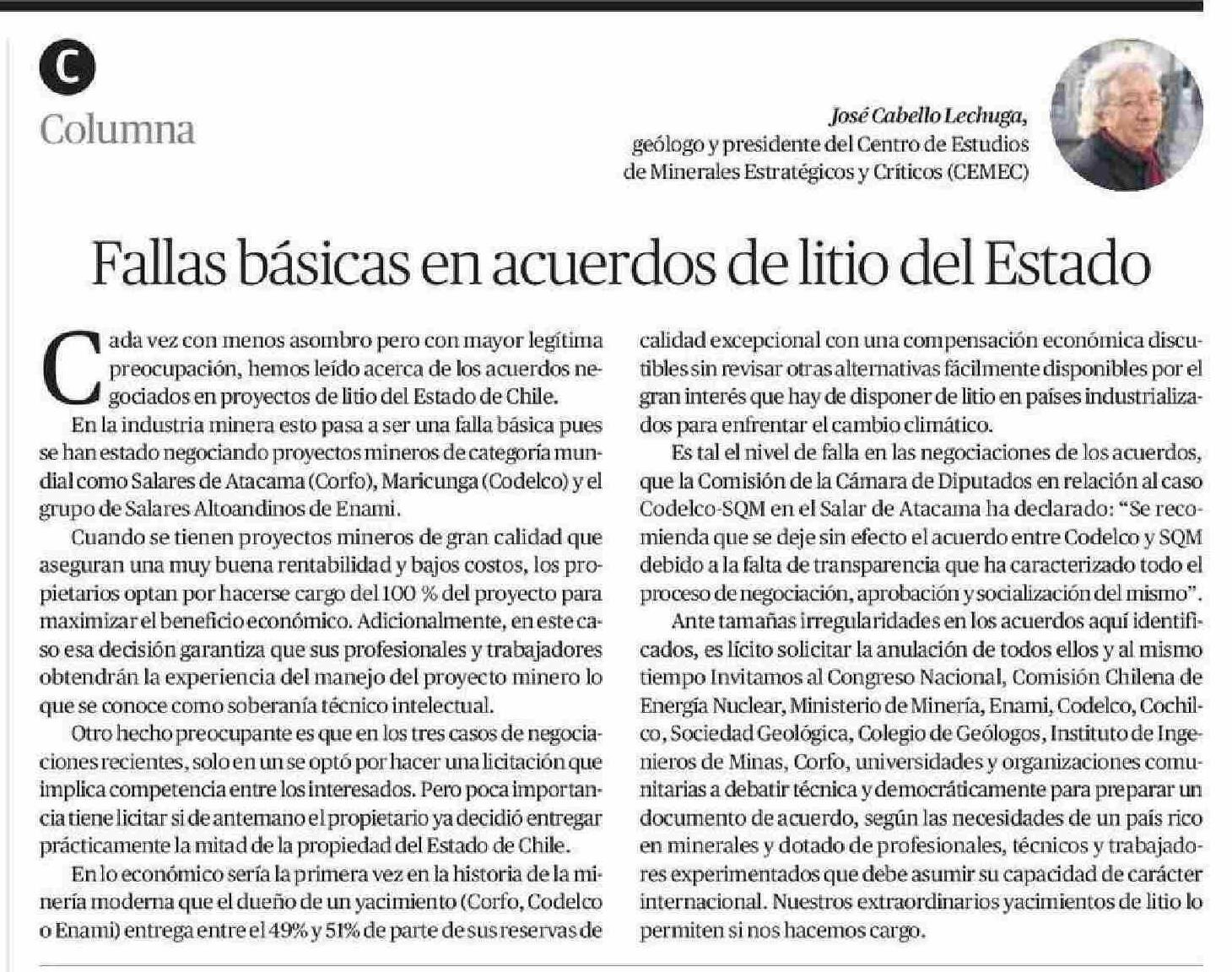 Columnas de Opinión: Fallas básicas en acuerdos de litio del Estado 09-06-2025 El Mercurio de Calama |