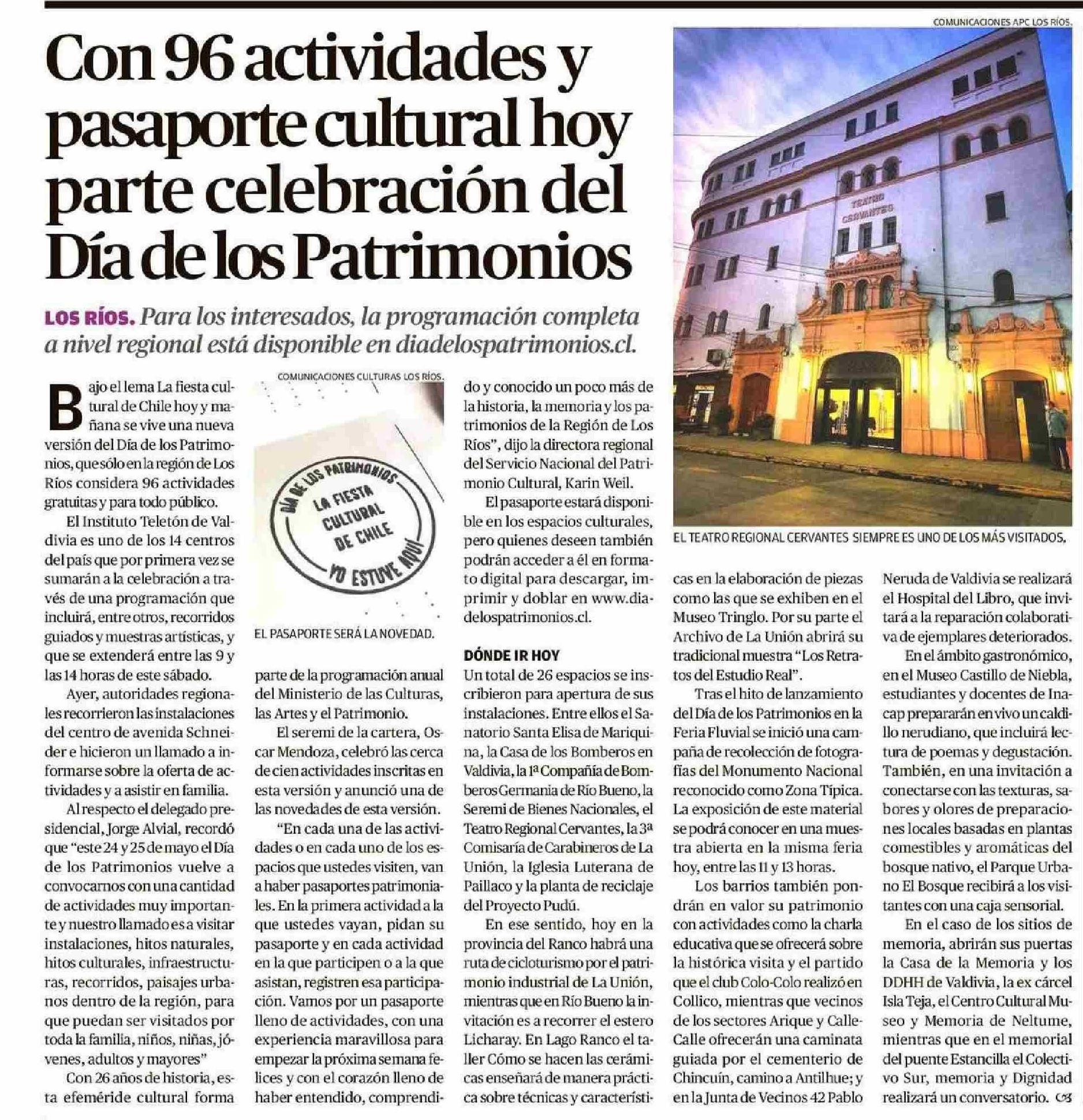 Con 96 actividades y pasaporte cultural hoy parte celebración del Día de los Patrimonios 24-05-2025 Diario Austral Región de Los Ríos |