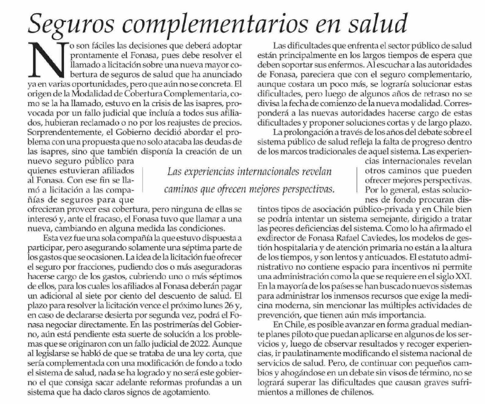 EDITORIAL: Seguros complementarios en salud 21-01-2026 El Mercurio |