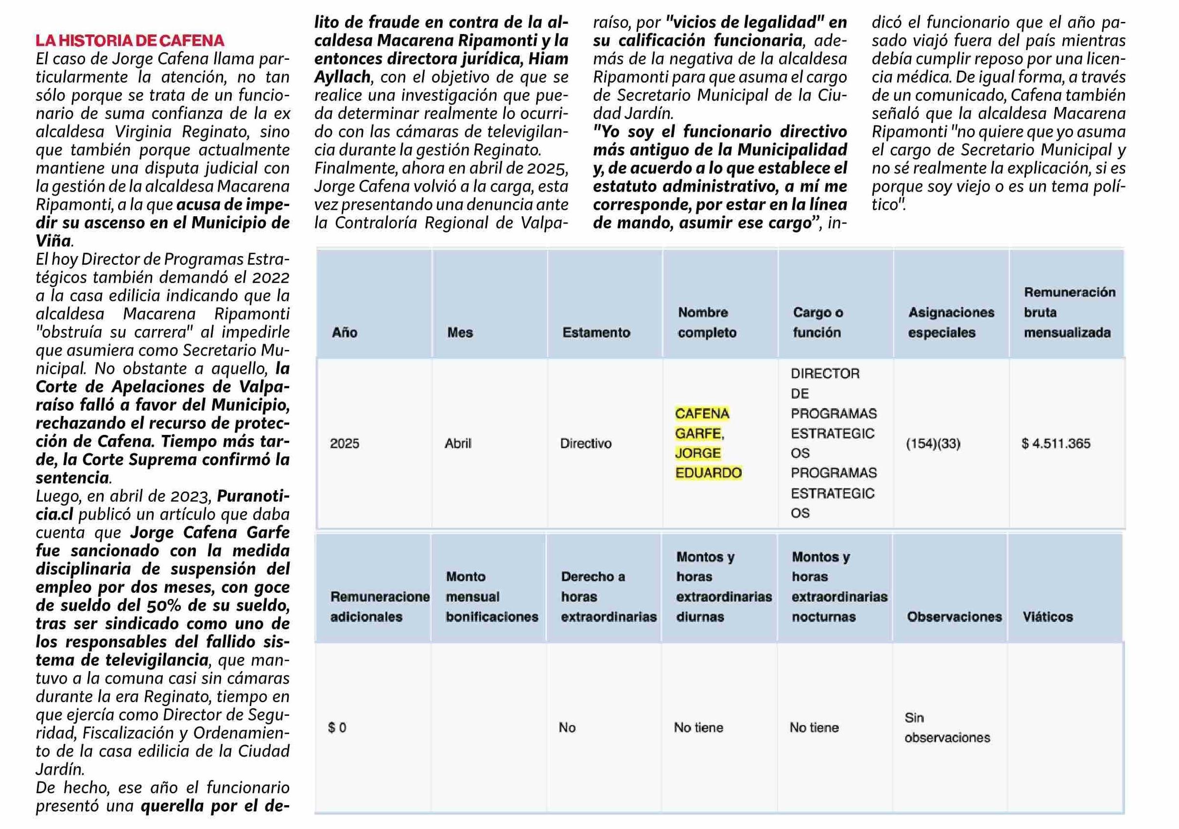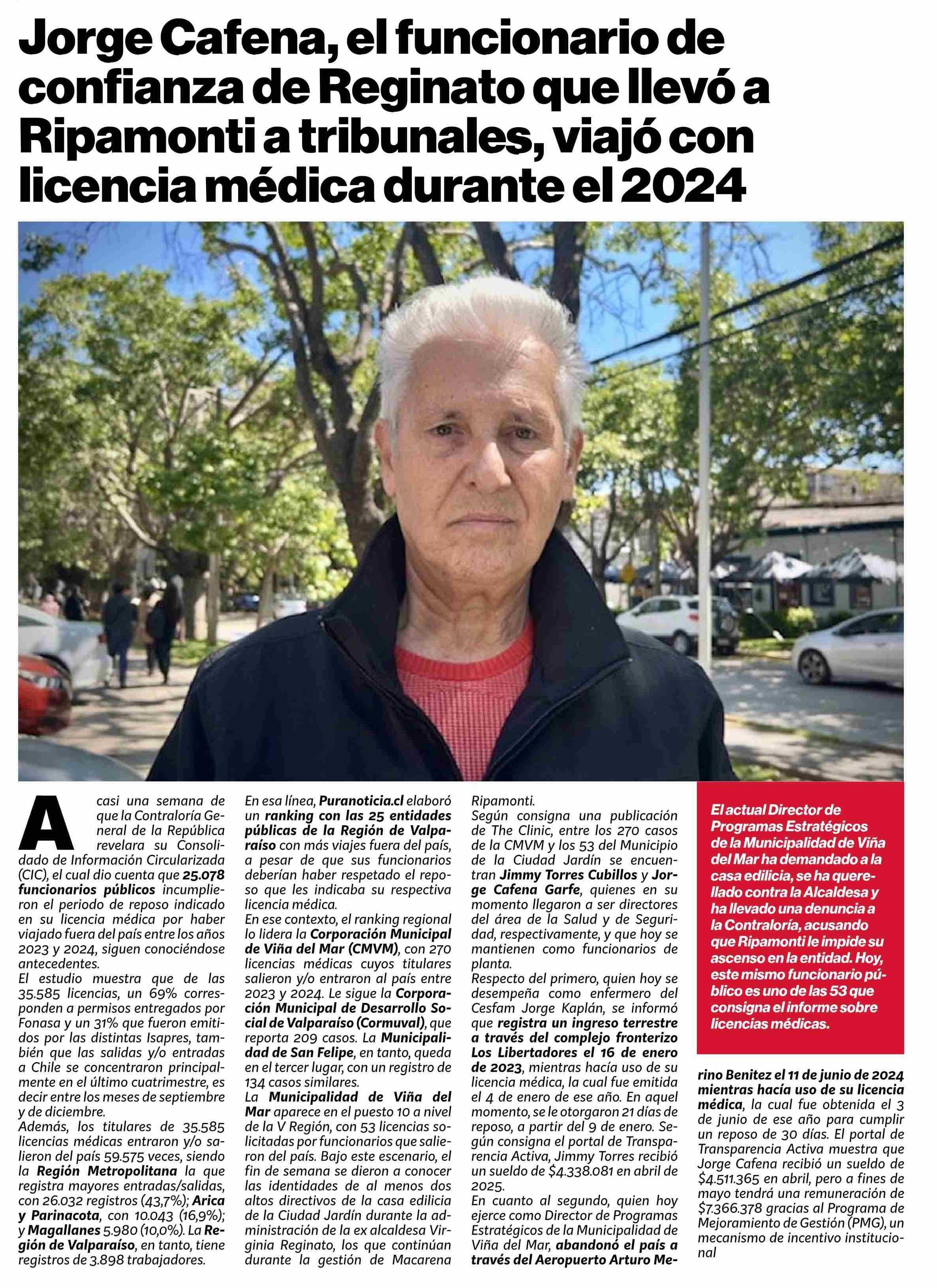 Jorge Cafena, el funcionario de confianza de Reginato que llevó a Ripamonti a tribunales, viajó con licencia médica durante el 2024 26-05-2025 Puranoticia.cl |