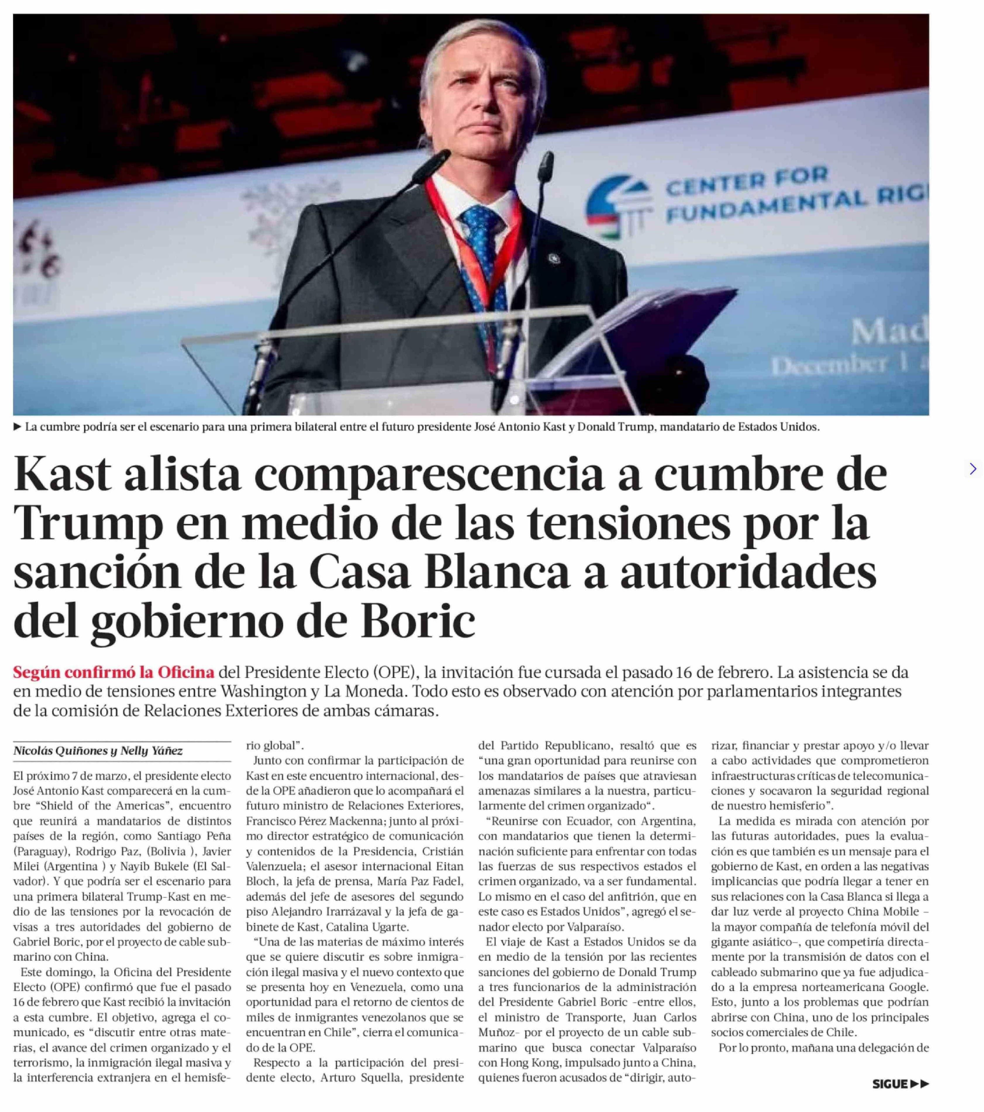 Título: Kast alista comparescencia a cumbre de Trump en medio de las tensiones por la sanción de la Casa Blanca a autoridades del gobierno de Boric