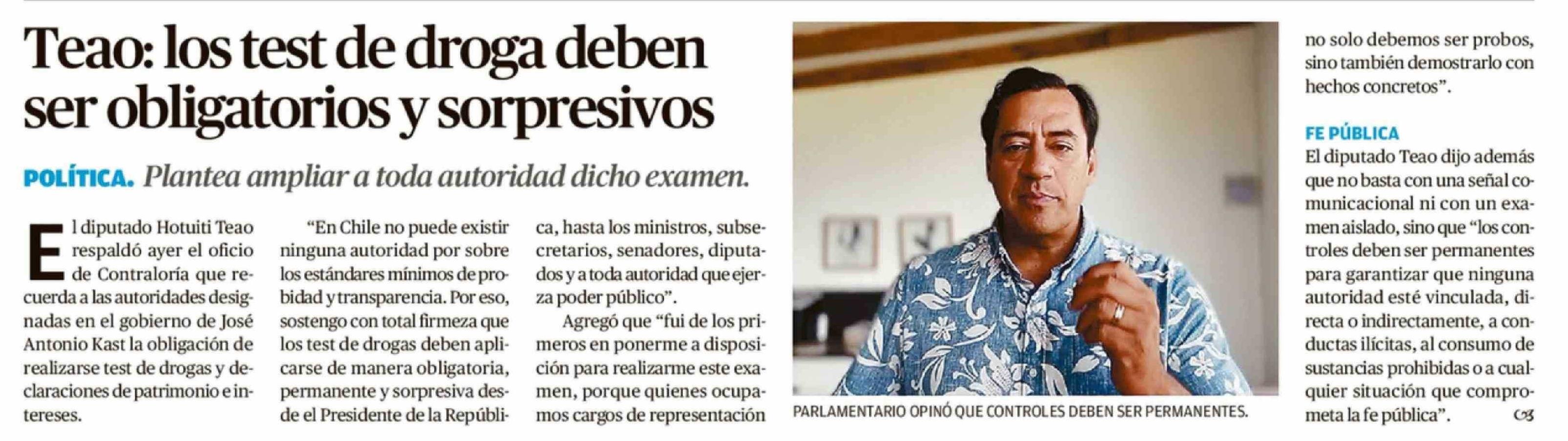 Teao: los test de droga deben ser obligatorios y sorpresivos 06-04-2026 El Mercurio de Valparaíso |