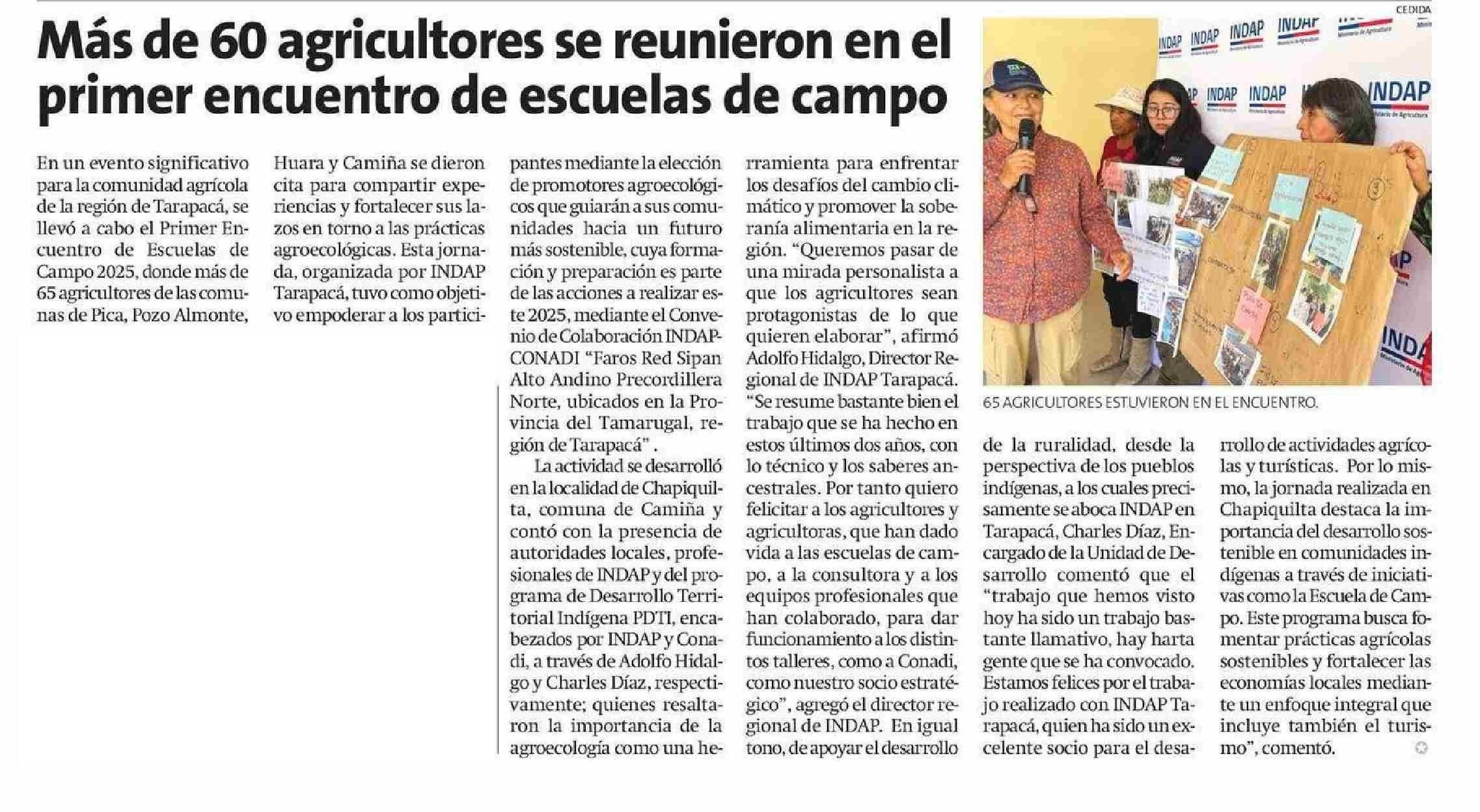 Más de 60 agricultores se reunieron en el primer encuentro de escuelas de campo 25-05-2025 La Estrella de Iquique |
