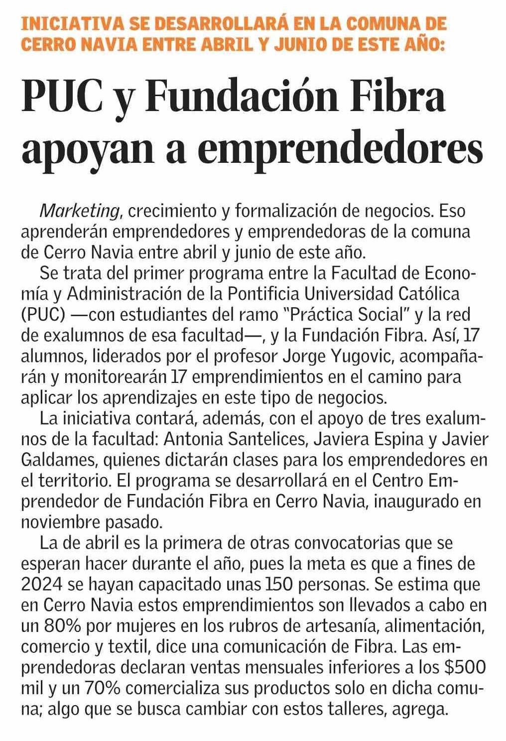 PUC y Fundación Fibra apoyan a emprendedores 31-03-2024 El Mercurio |
