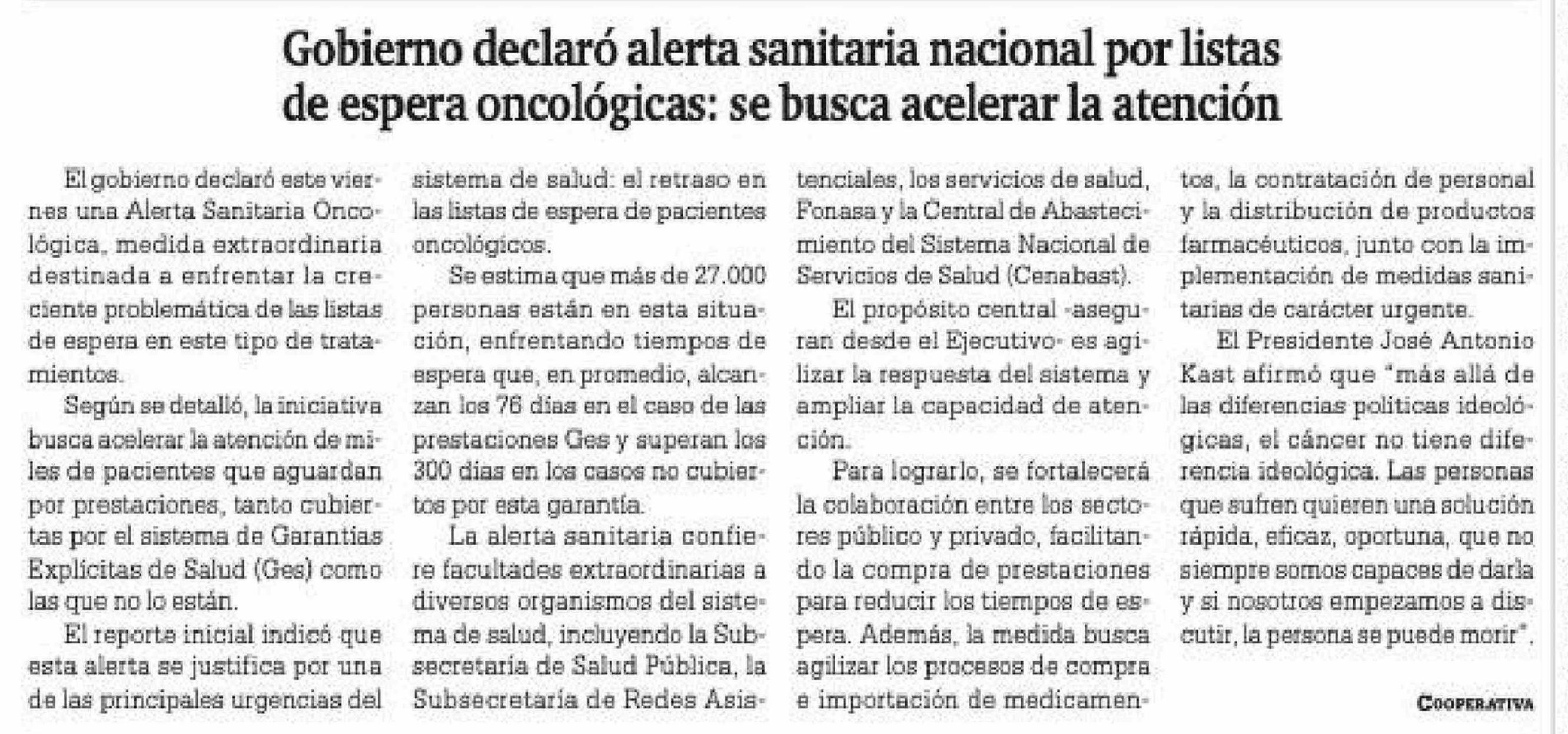 Gobierno declaró alerta sanitaria nacional por listas de espera oncológicas: se busca acelerar la atención 21-03-2026 La Prensa Austral |