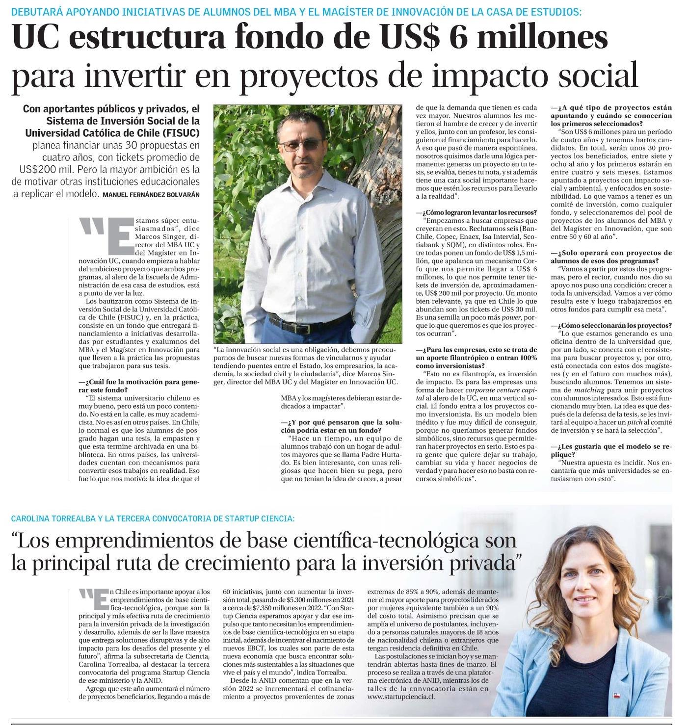 UC estructura fondo de US$ 6 millones para invertir en proyectos de impacto social 20-01-2022 El Mercurio |