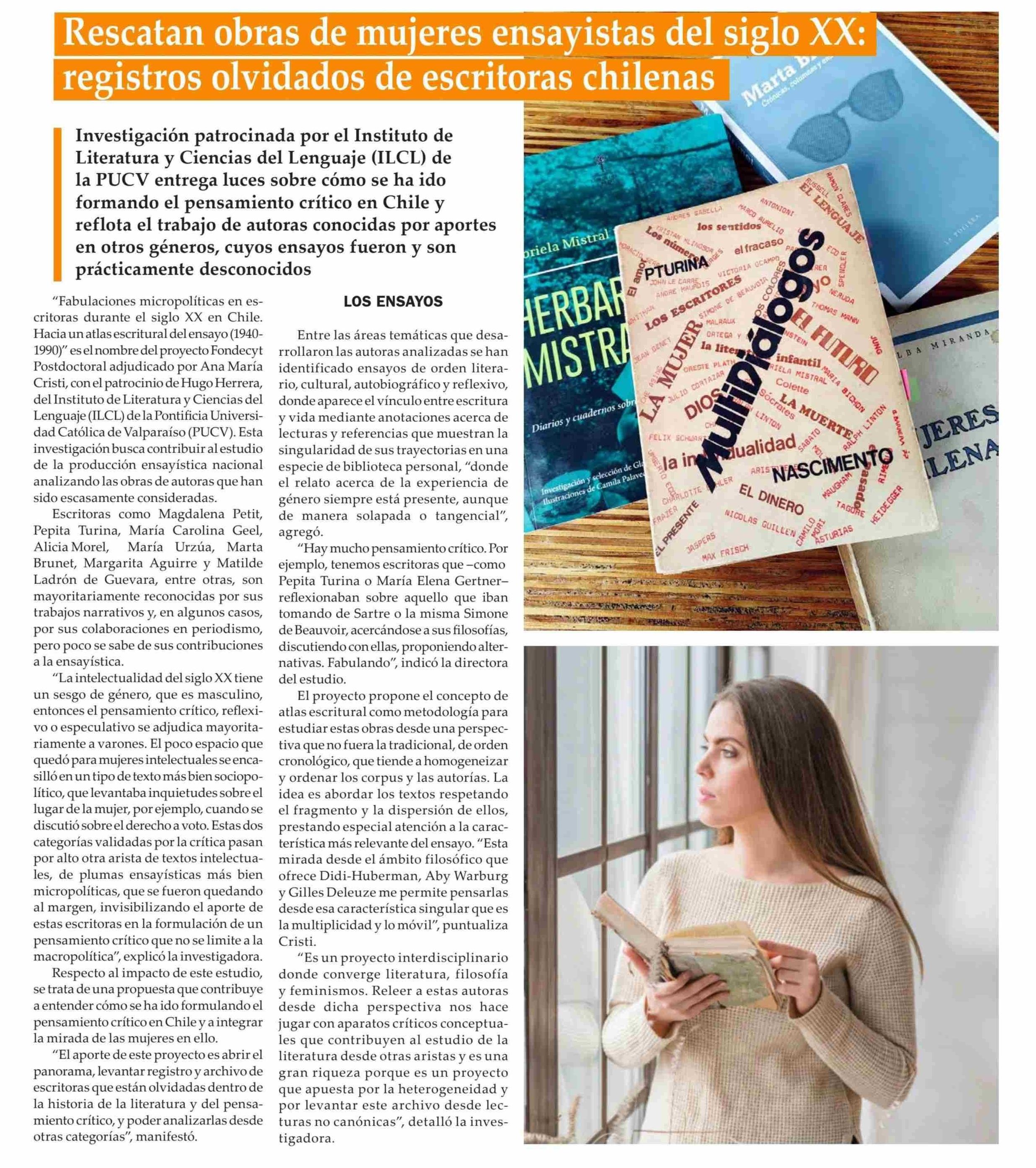 | Título: | Rescatan obras de muieres ensayistas del siglo XX: registros olvidados de escritoras chilenas |