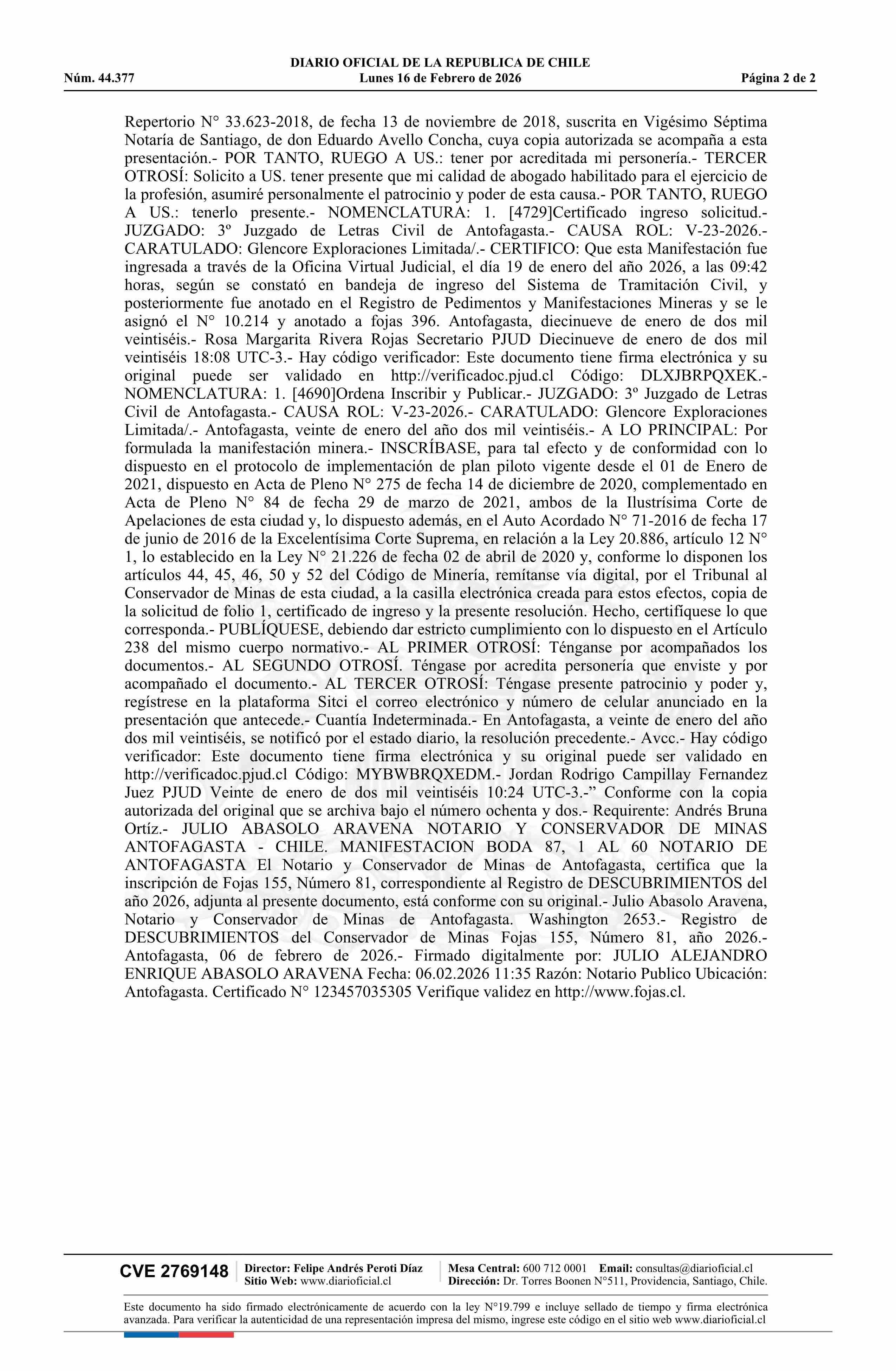 BODA 87, 1 AL 60 / Glencore Exploraciones Limitada 16-02-2026 DIARIO OFICIAL CHILE - BOLETÍN OFICIAL DE MINERÍA |