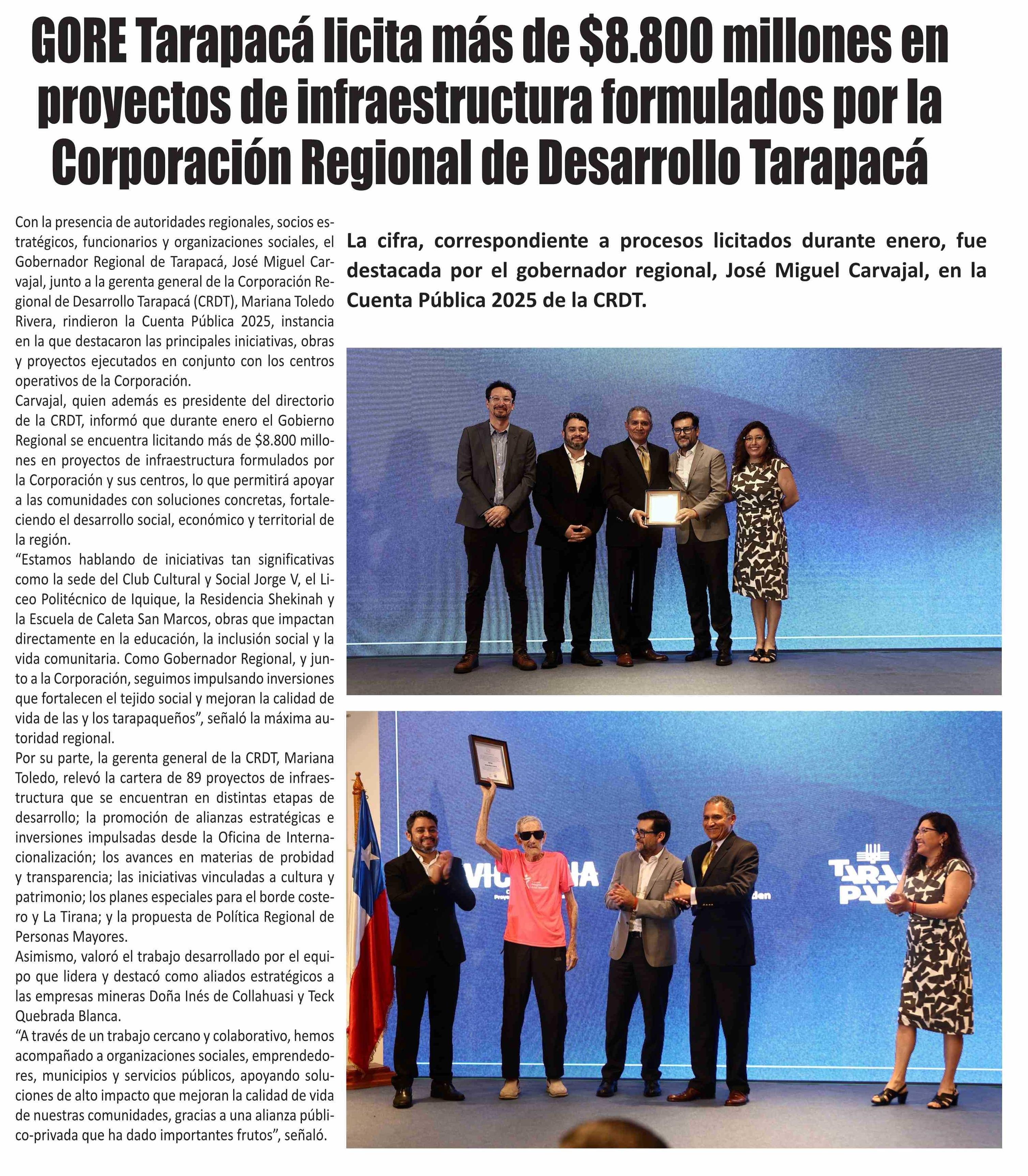 Título: GORE Tarapacá licita más de $8.800 millones en proyectos de infraestructura formulados por la Corporación Regional de Desarrollo Tarapacá