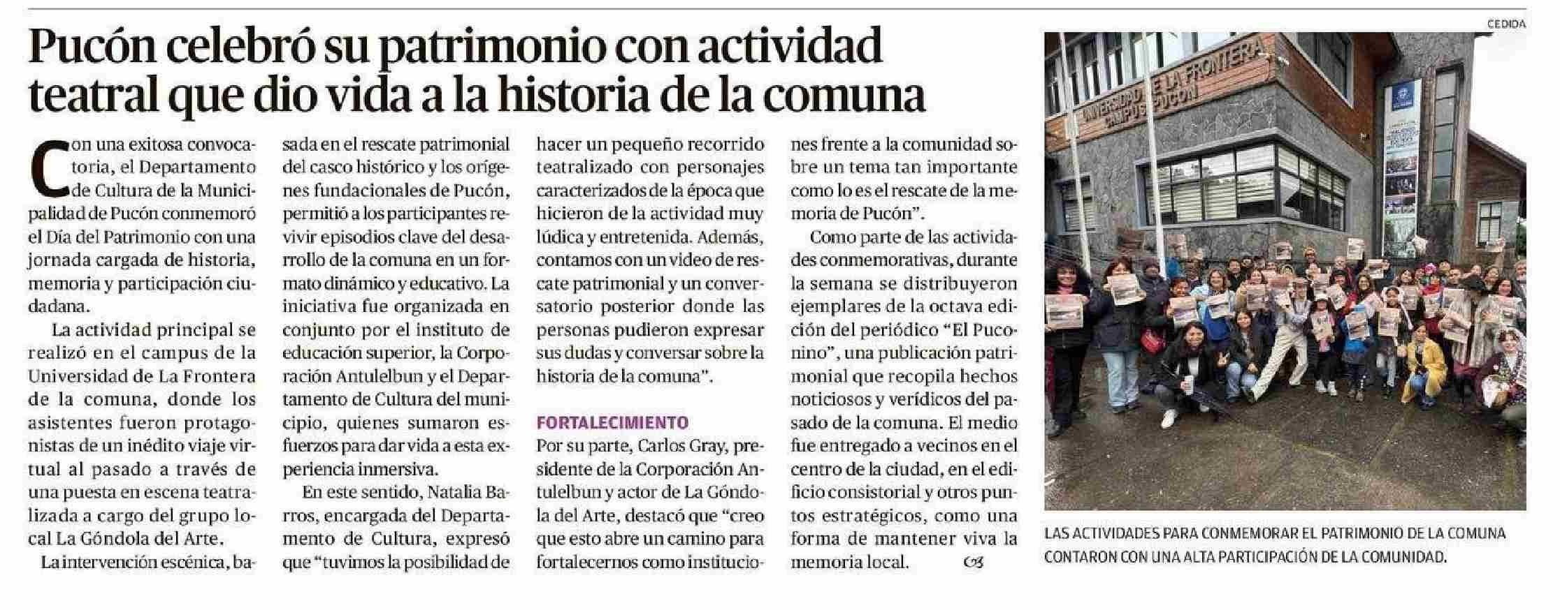 Pucón celebró su patrimonio con actividad teatral que dio vida a la historia de la comuna 29-05-2025 El Austral de la Araucanía |