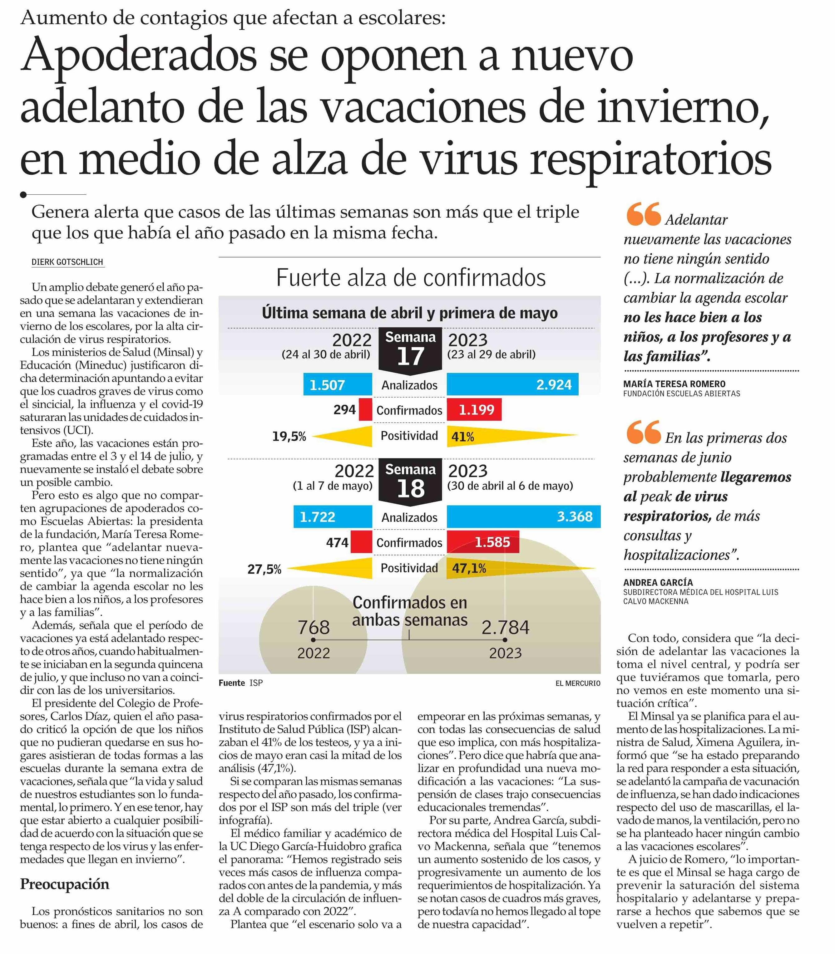 Apoderados se oponen a nuevo adelanto de las vacaciones de invierno, en medio de alza de virus respiratorios 17-05-2023 El Mercurio |