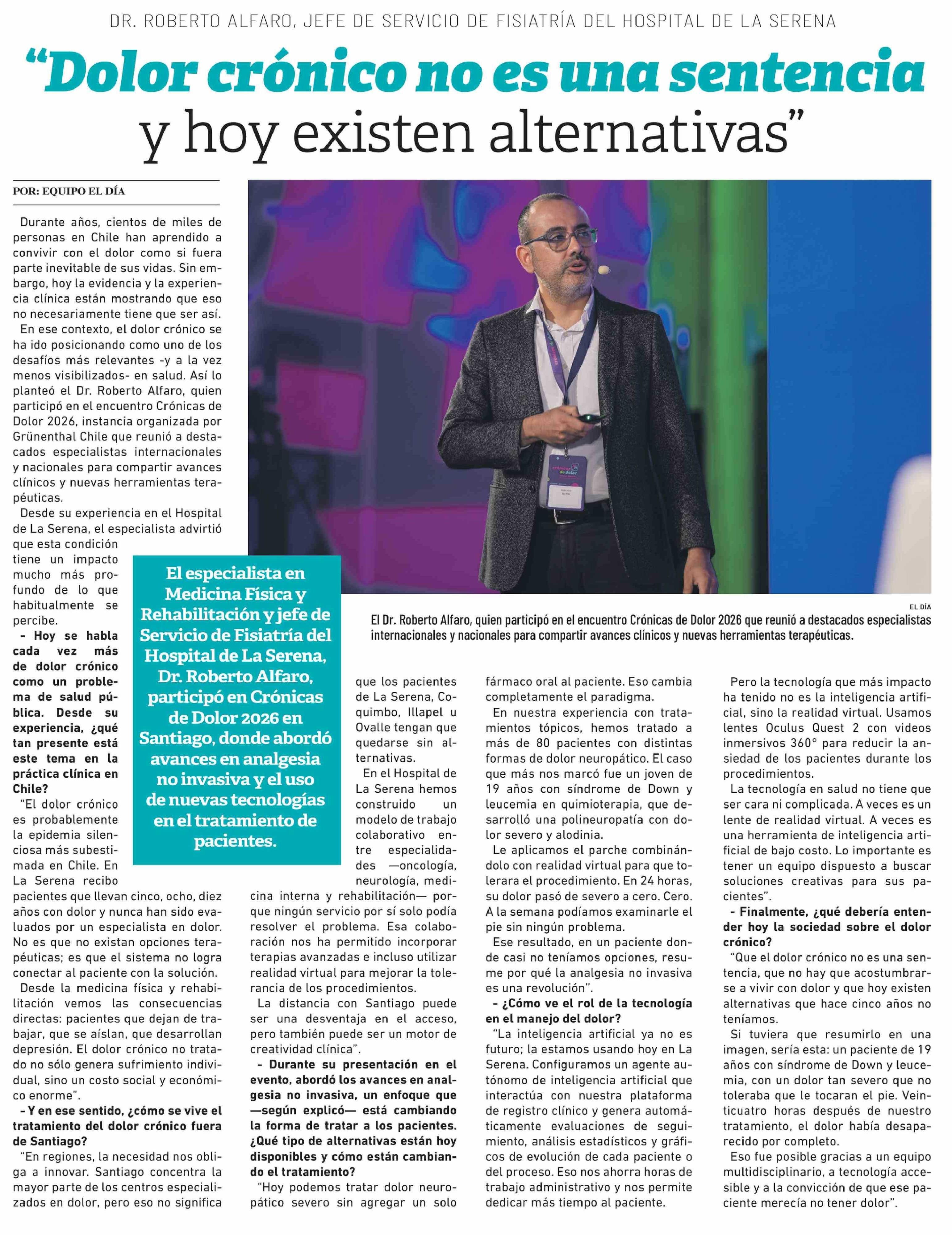 "Dolor crónico no es una sentencia y hoy existen alternativas" 26-04-2026 El Día |