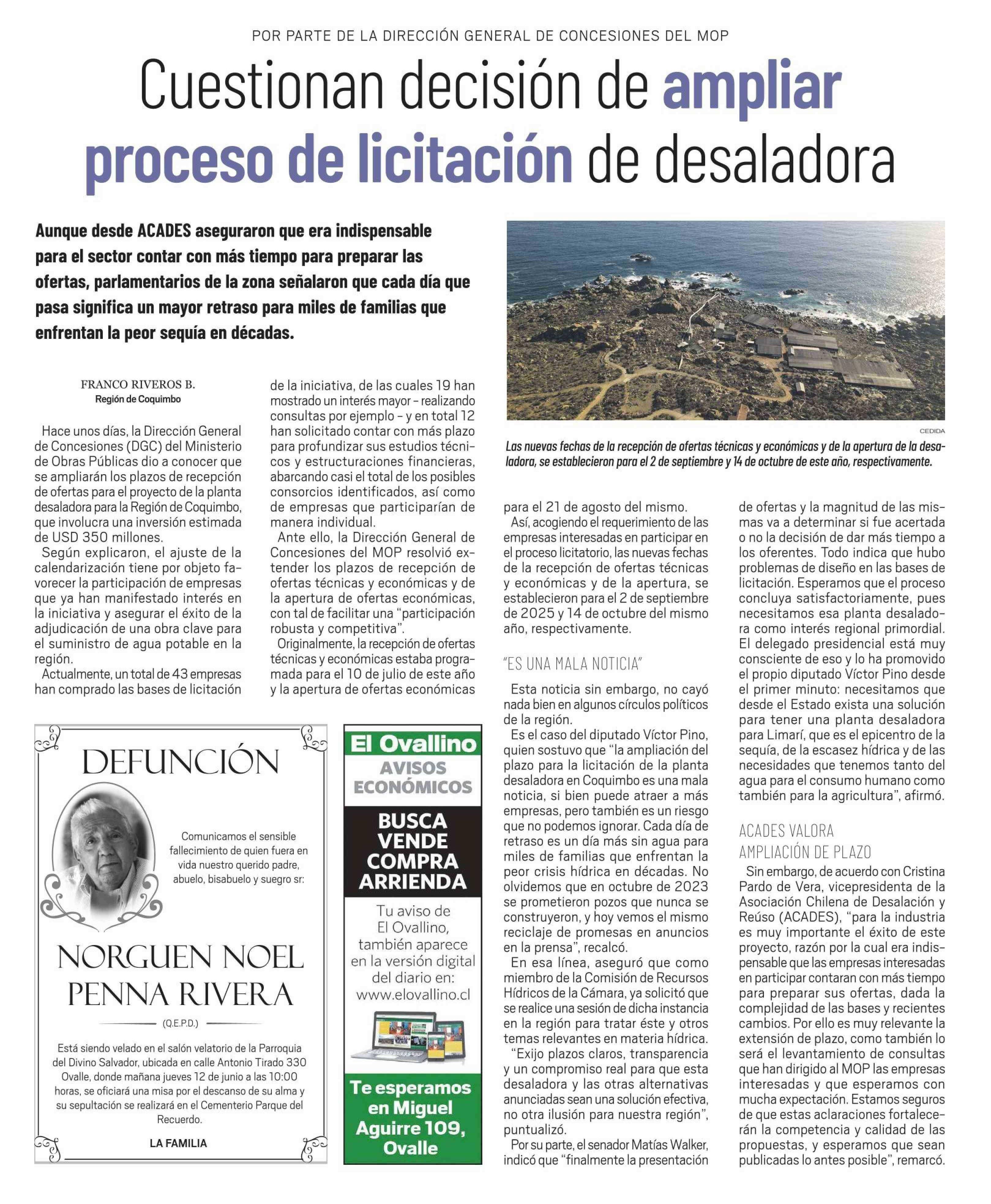 Cuestionan decisión de ampliar proceso de licitación de desaladora 11-06-2025 El Ovallino |