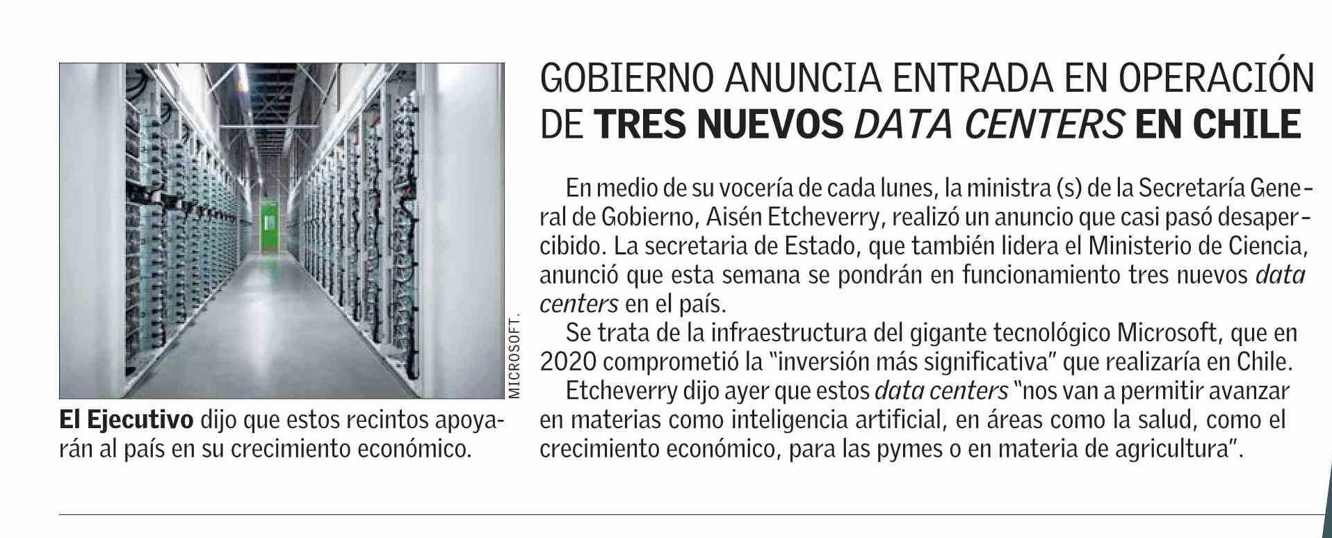 GOBIERNO ANUNCIA ENTRADA EN OPERACIÓN DE TRES NUEVOS DATA CENTERS EN CHILE 17-06-2025 El Mercurio |