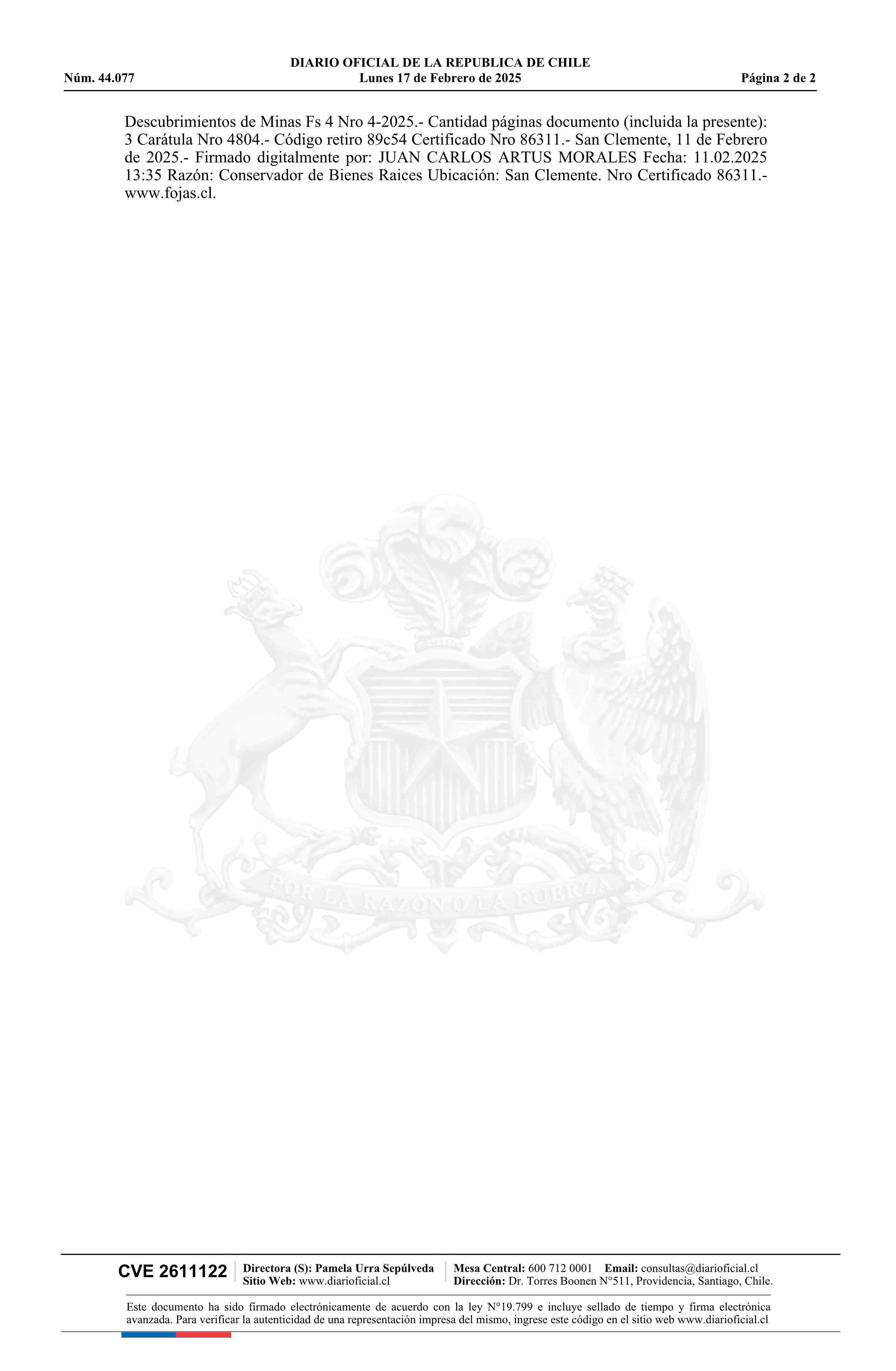 | Fuente: | DIARIO OFICIAL CHILE - BOLETÍN OFICIAL DE MINERÍA (DIARIO OFICIAL CHILE – BOM – MANIFESTACIONES MIN) | Página(s): | 48-49 |