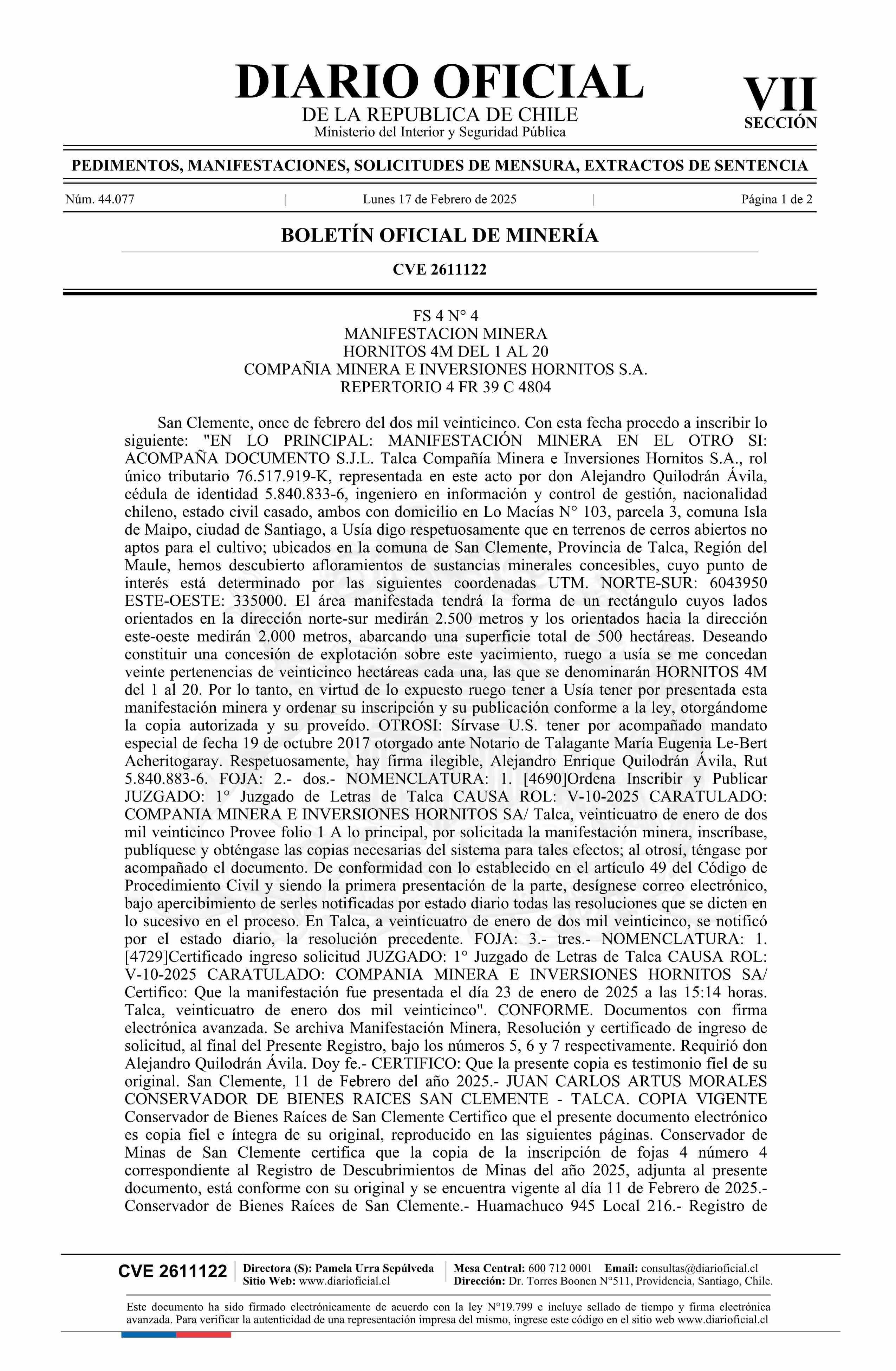 HORNITOS 4M del 1 al 20 / Compañía Minera e Inversiones Hornitos S.A. 17-02-2025 DIARIO OFICIAL CHILE - BOLETÍN OFICIAL DE MINERÍA |