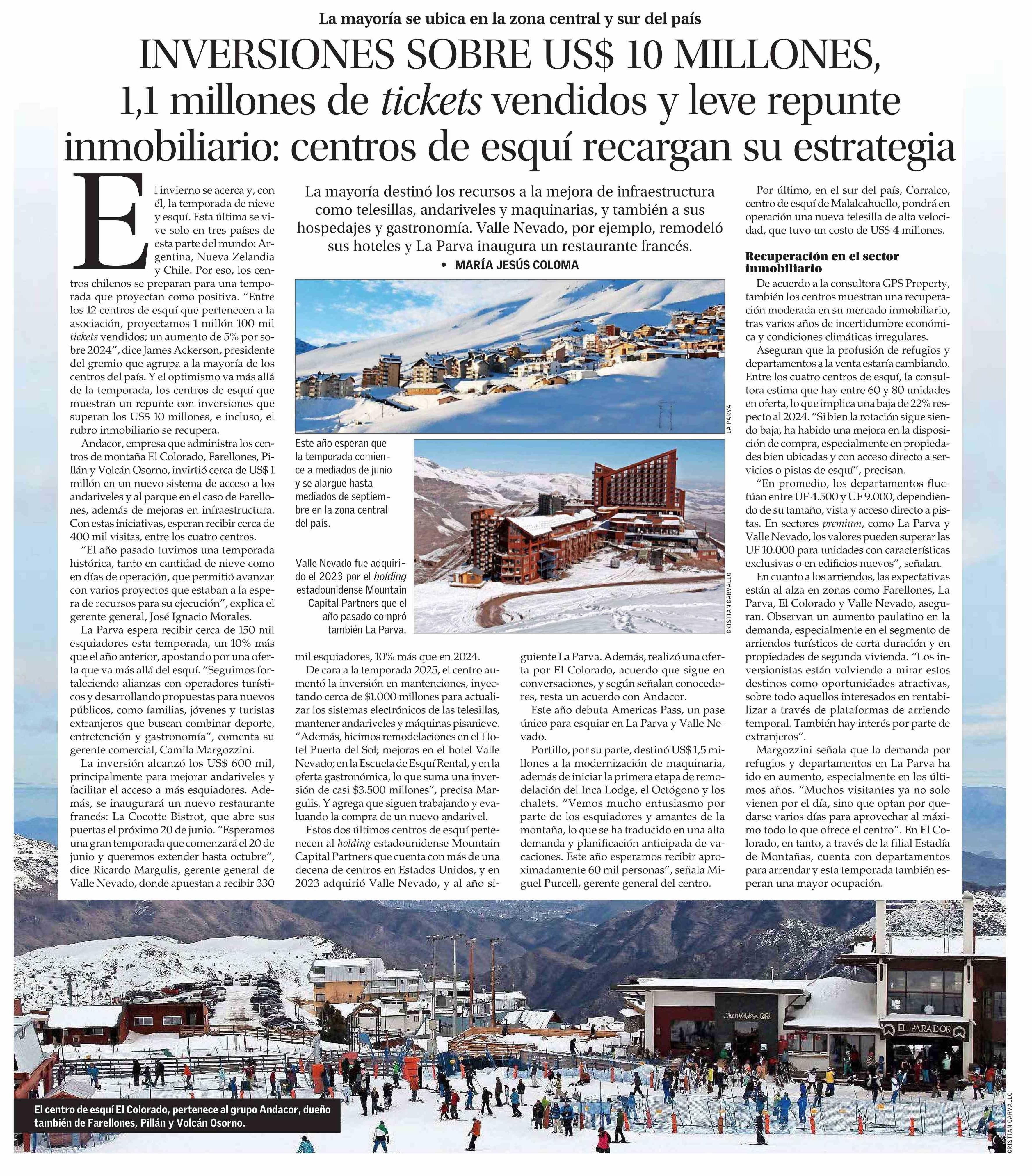INVERSIONES SOBRE US$ 10 MILLONES, 1,1 millones de tickets vendidos y leve repunte inmobiliario: centros de esquí recargan su estrategia 25-05-2025 El Mercurio |