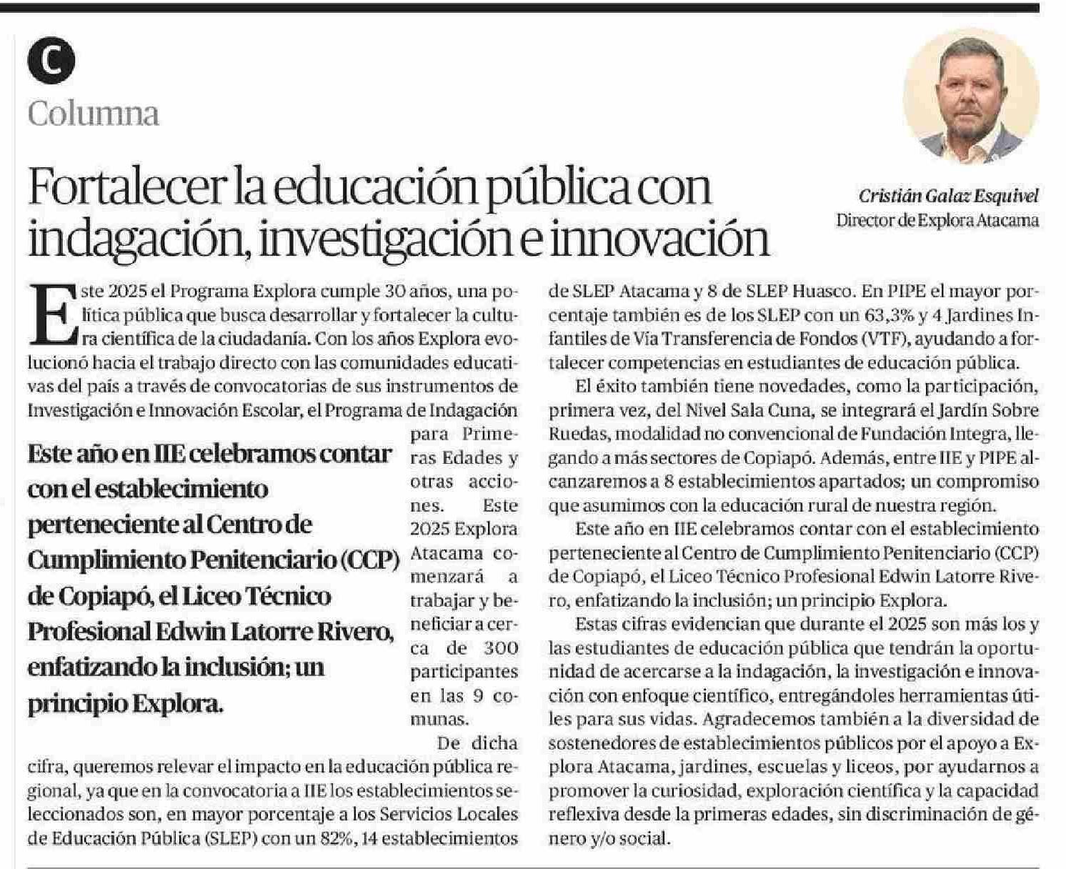 Columnas de Opinión: Fortalecer la educación pública con indagación, investigación e innovación 27-05-2025 El Diario de Atacama |