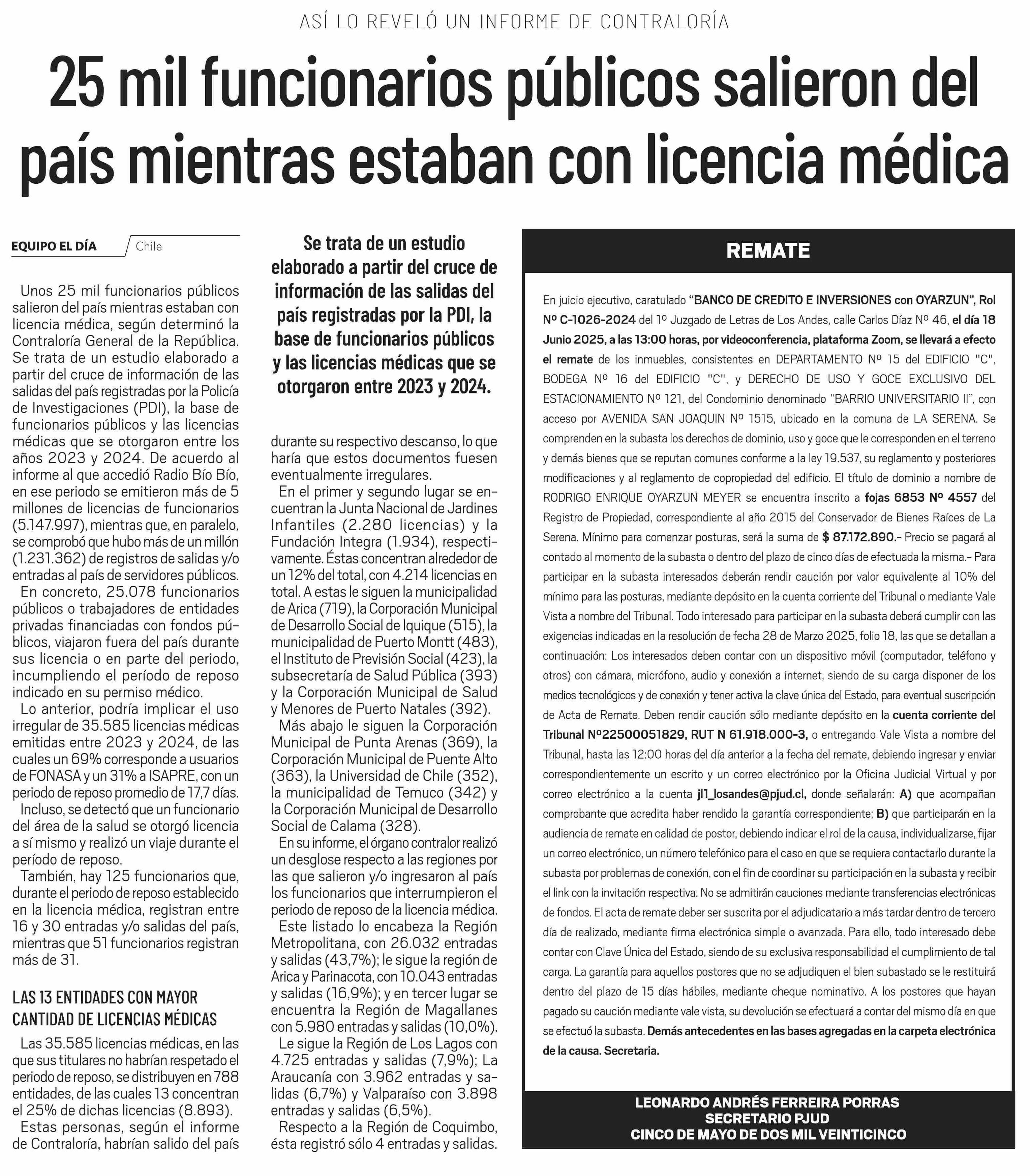 25 Mil funcionarios públicos salieron del país mientras estaban con licencia médica 21-05-2025 El Día |