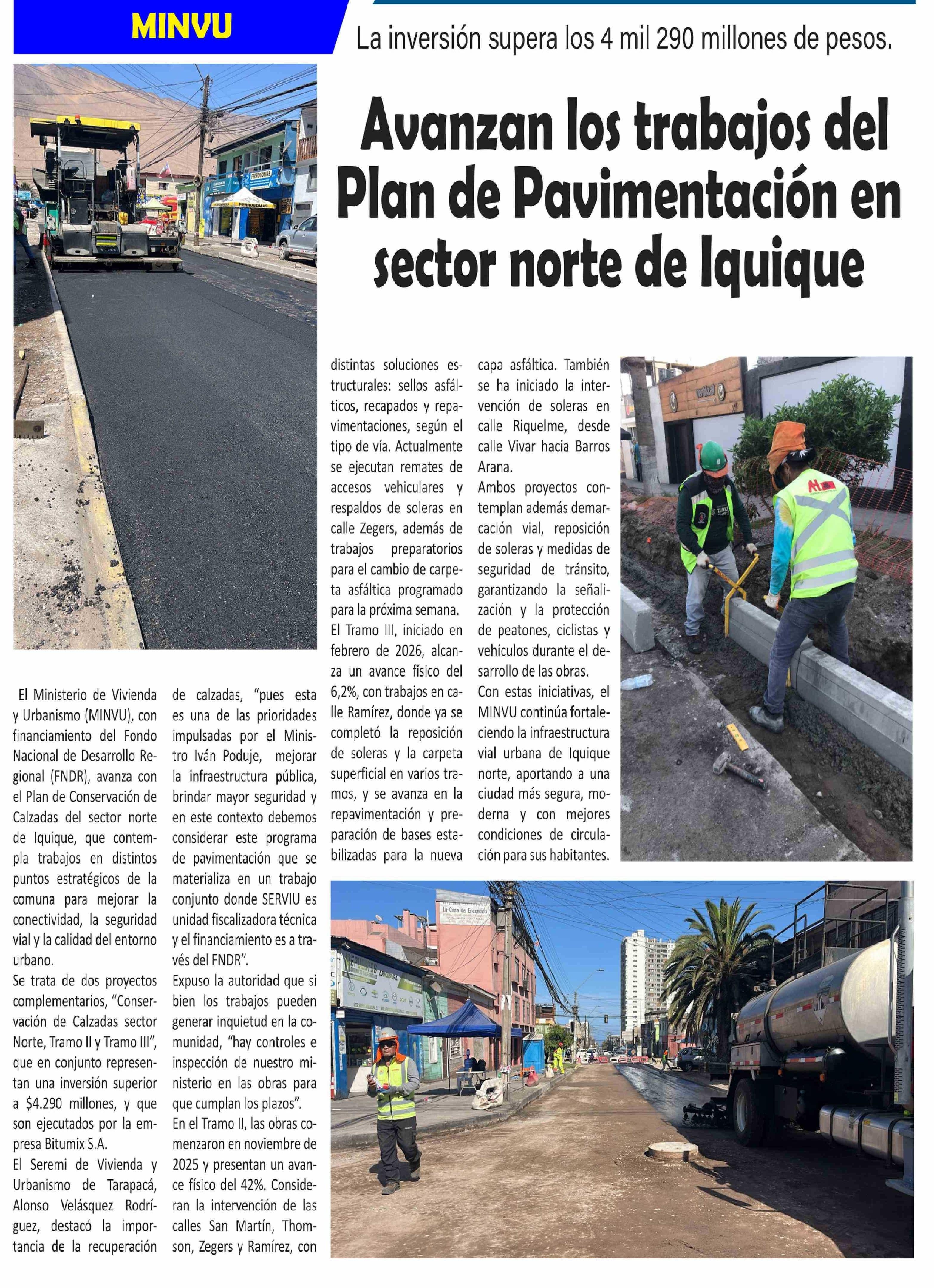 Avanzan los trabajos del Plan de Pavimentación en sector norte de Iquique 14-04-2026 El Longino |