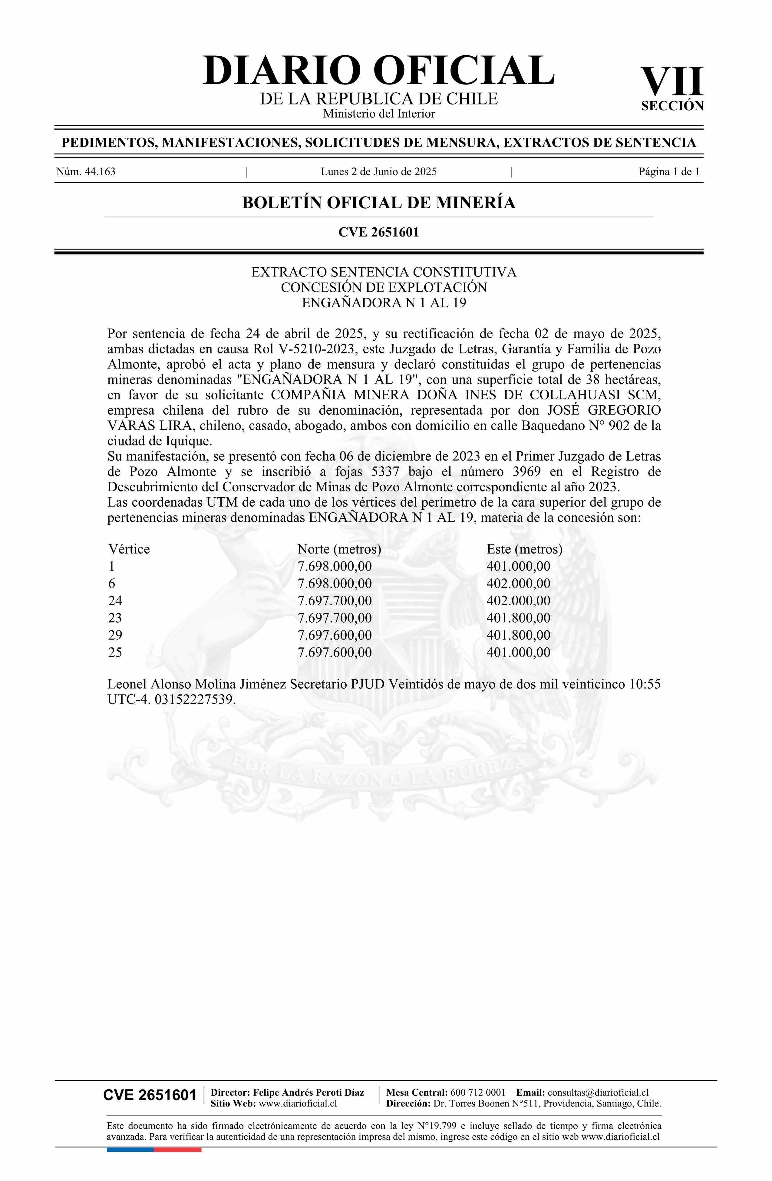 ENGAÑADORA N 1 AL 19 / Compañía Minera Doña Inés de Collahuasi SCM 02-06-2025 DIARIO OFICIAL CHILE - BOLETÍN OFICIAL DE MINERÍA |