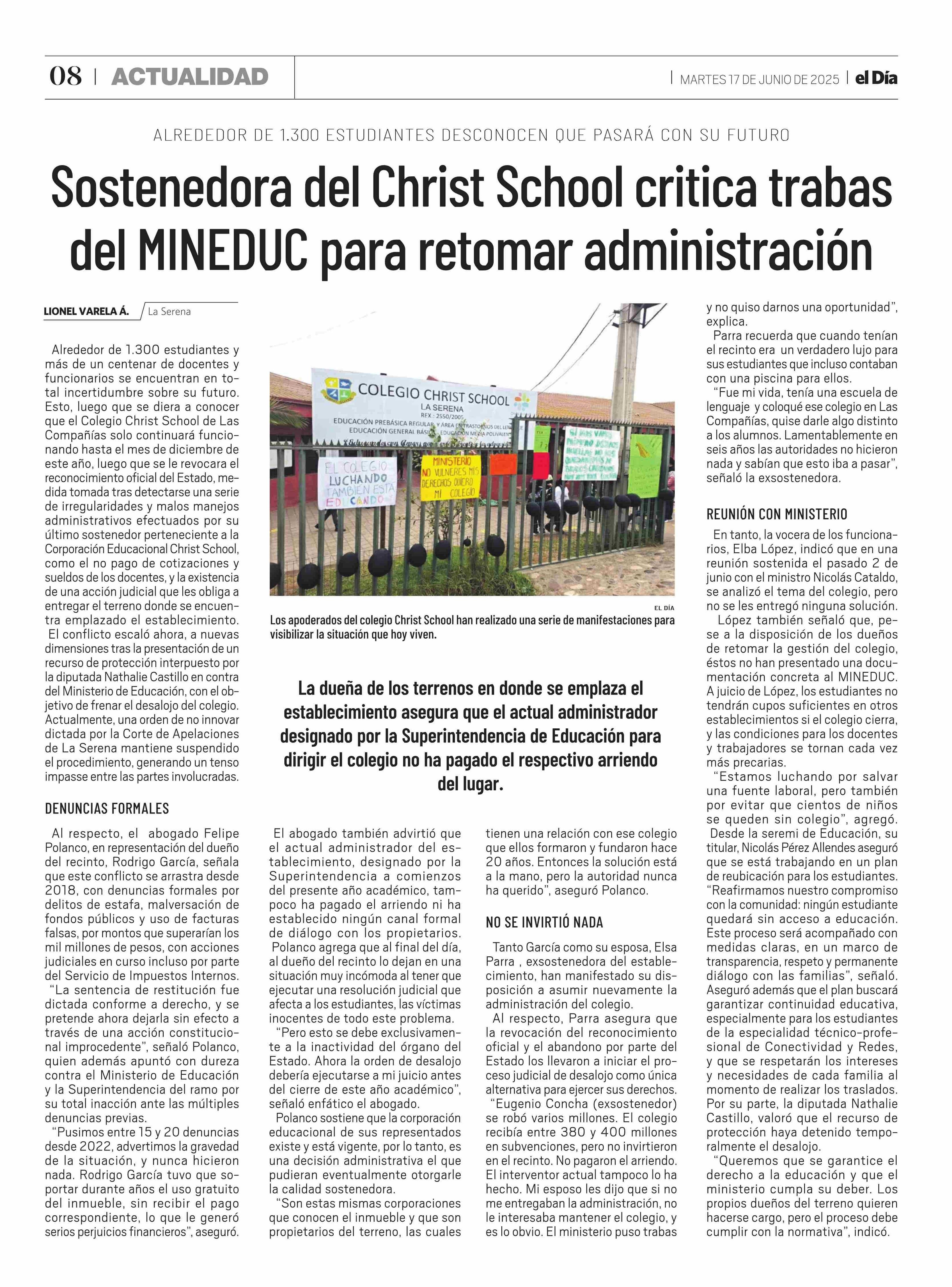 Sostenedora del Christ School critica trabas del MINEDUC para retomar administración 17-06-2025 El Día |
