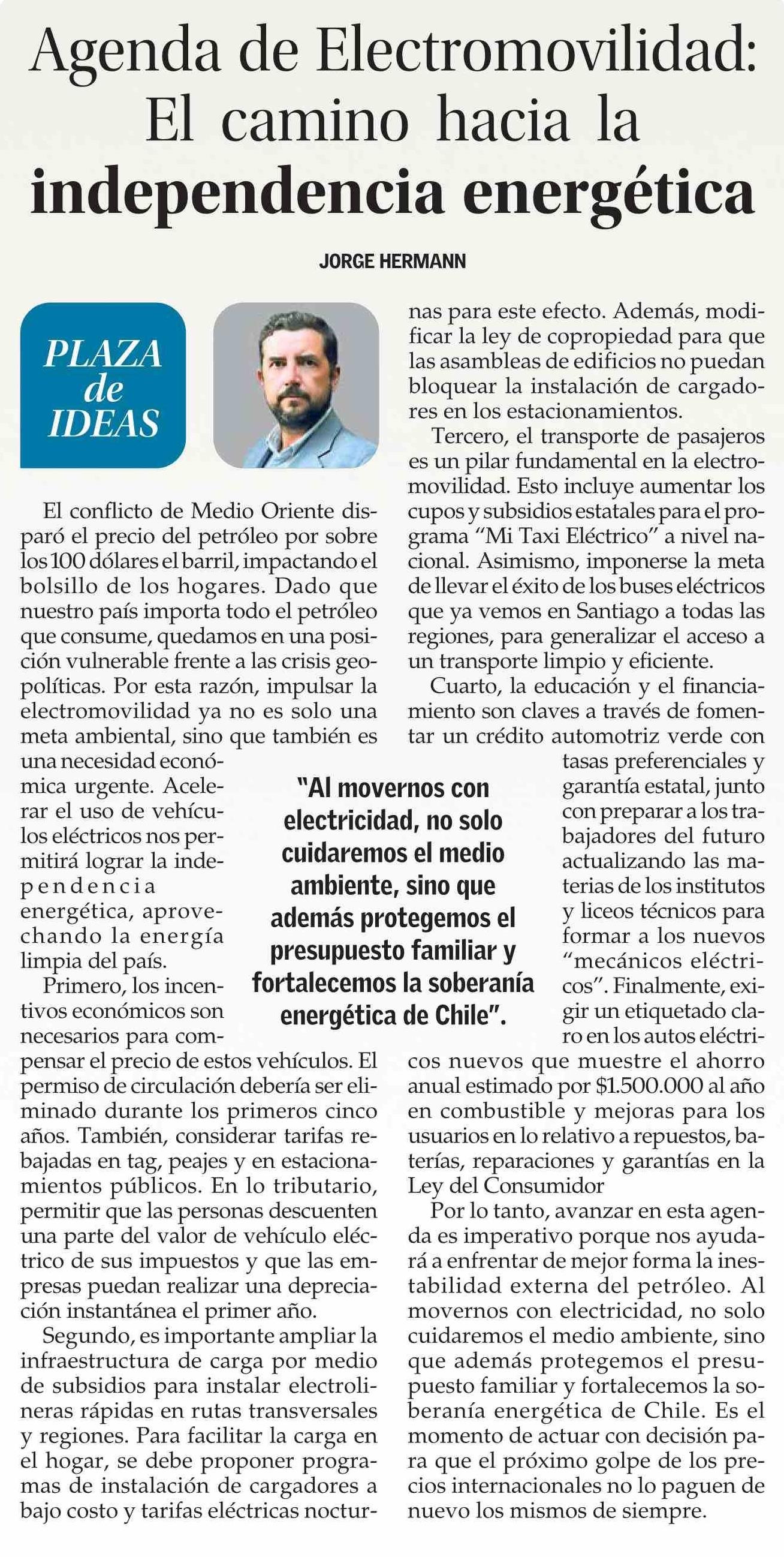Columnas de Opinión: Agenda de Electromovilidad: El camino hacia la independencia energética 23-04-2026 El Mercurio |