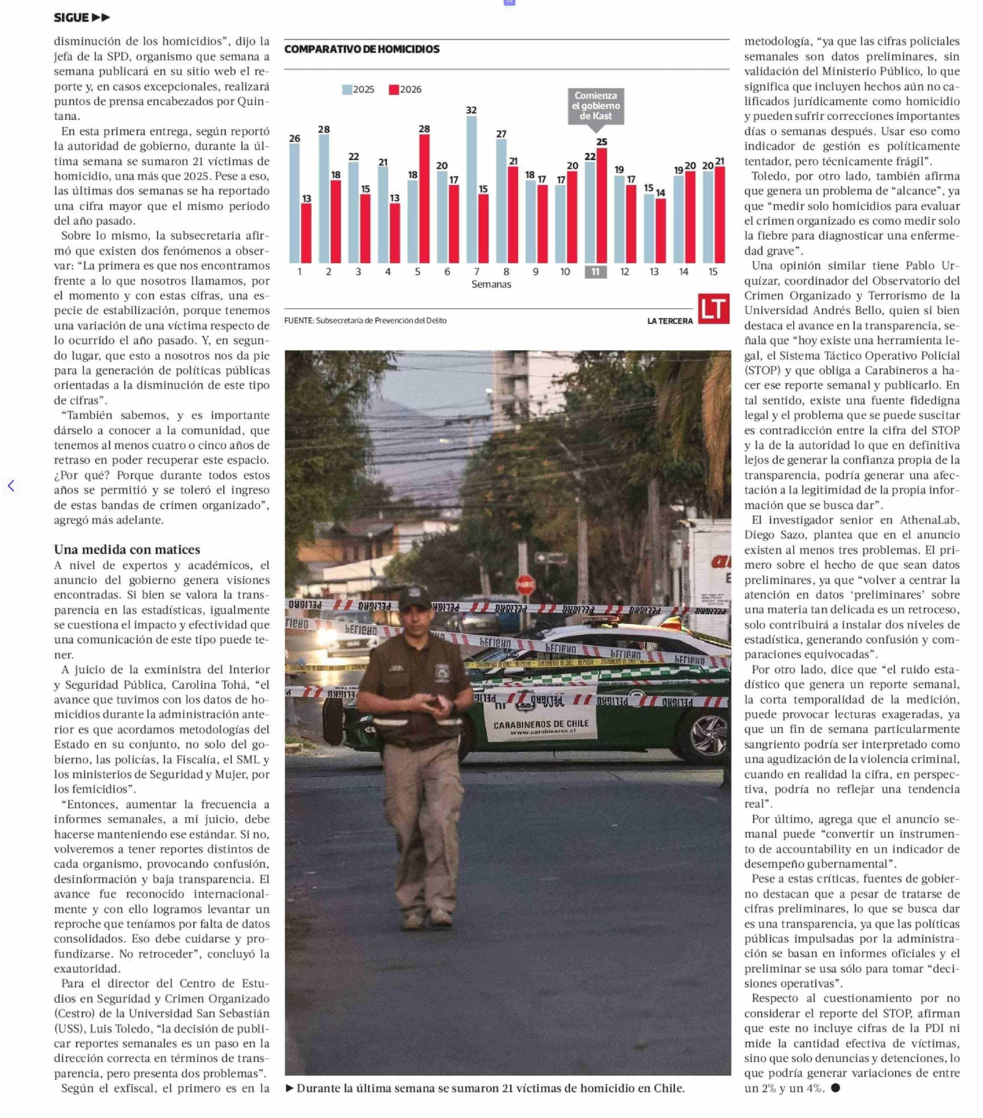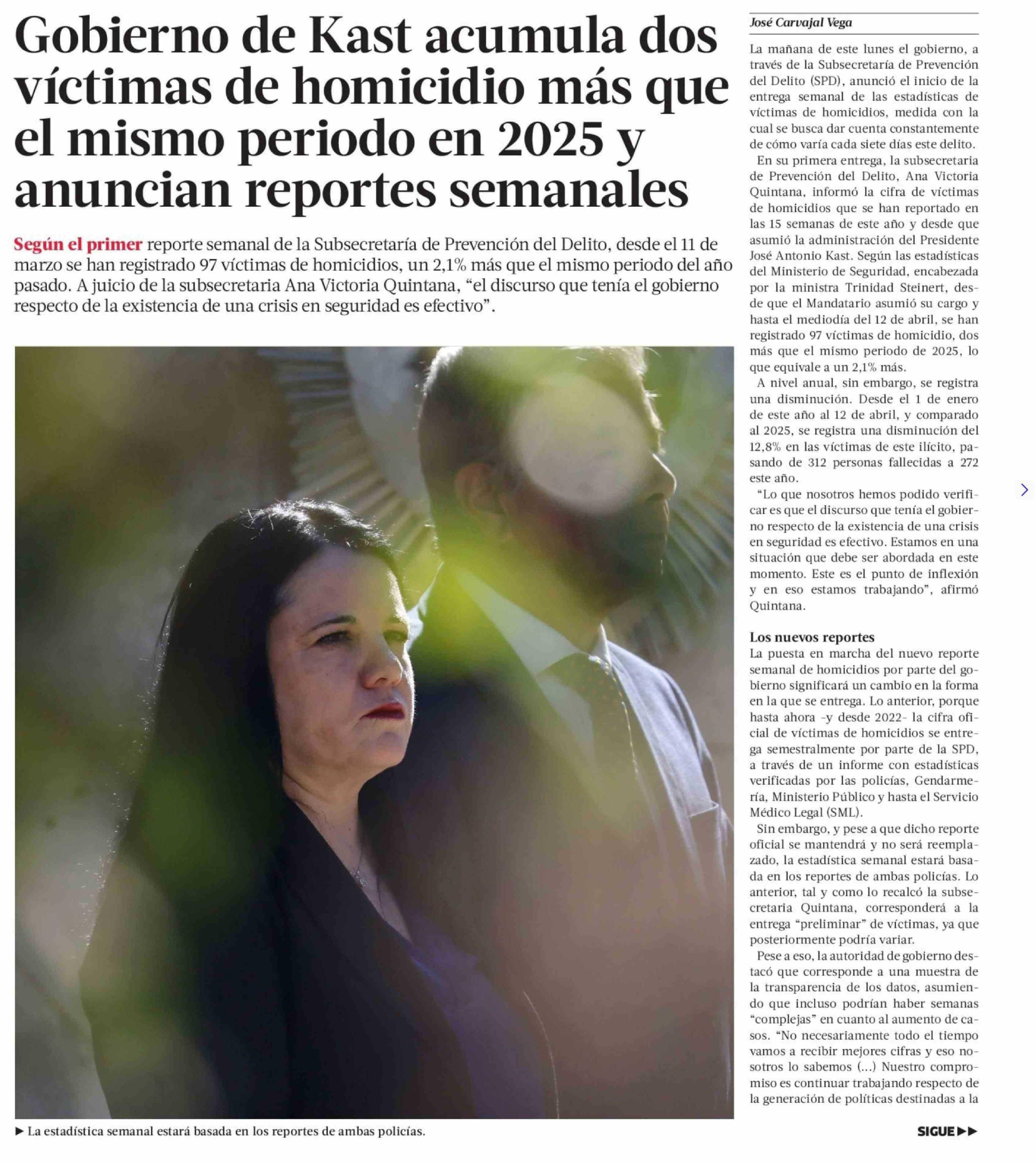Gobierno de Kast acumula dos víctimas de homicidio más que el mismo periodo en 2025 y anuncian reportes semanales 14-04-2026 La Tercera |